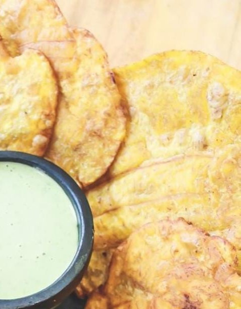 Con salsa cremosa de ajo, acompañados de sancocho de pescado, Chips de platano y ensalada.