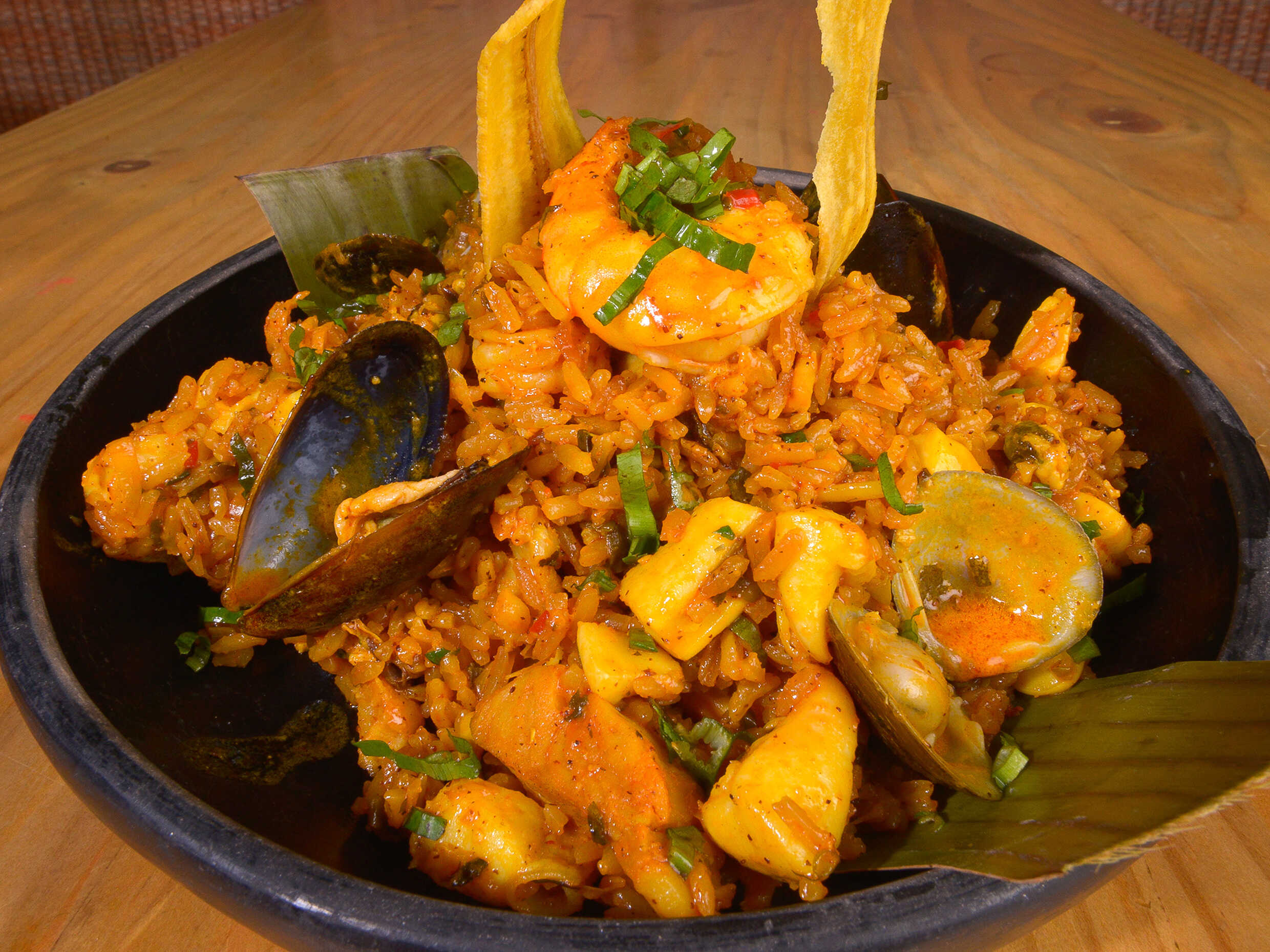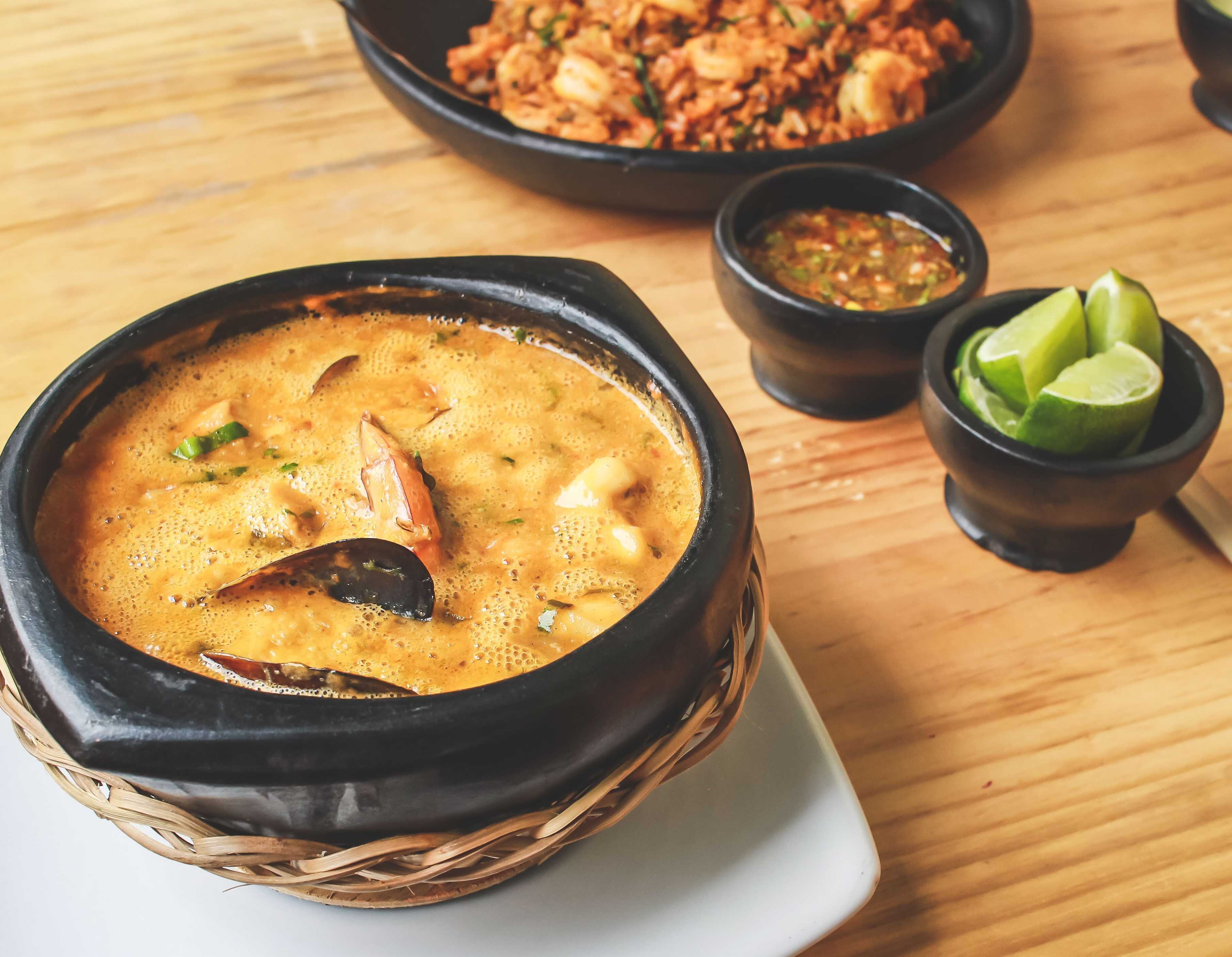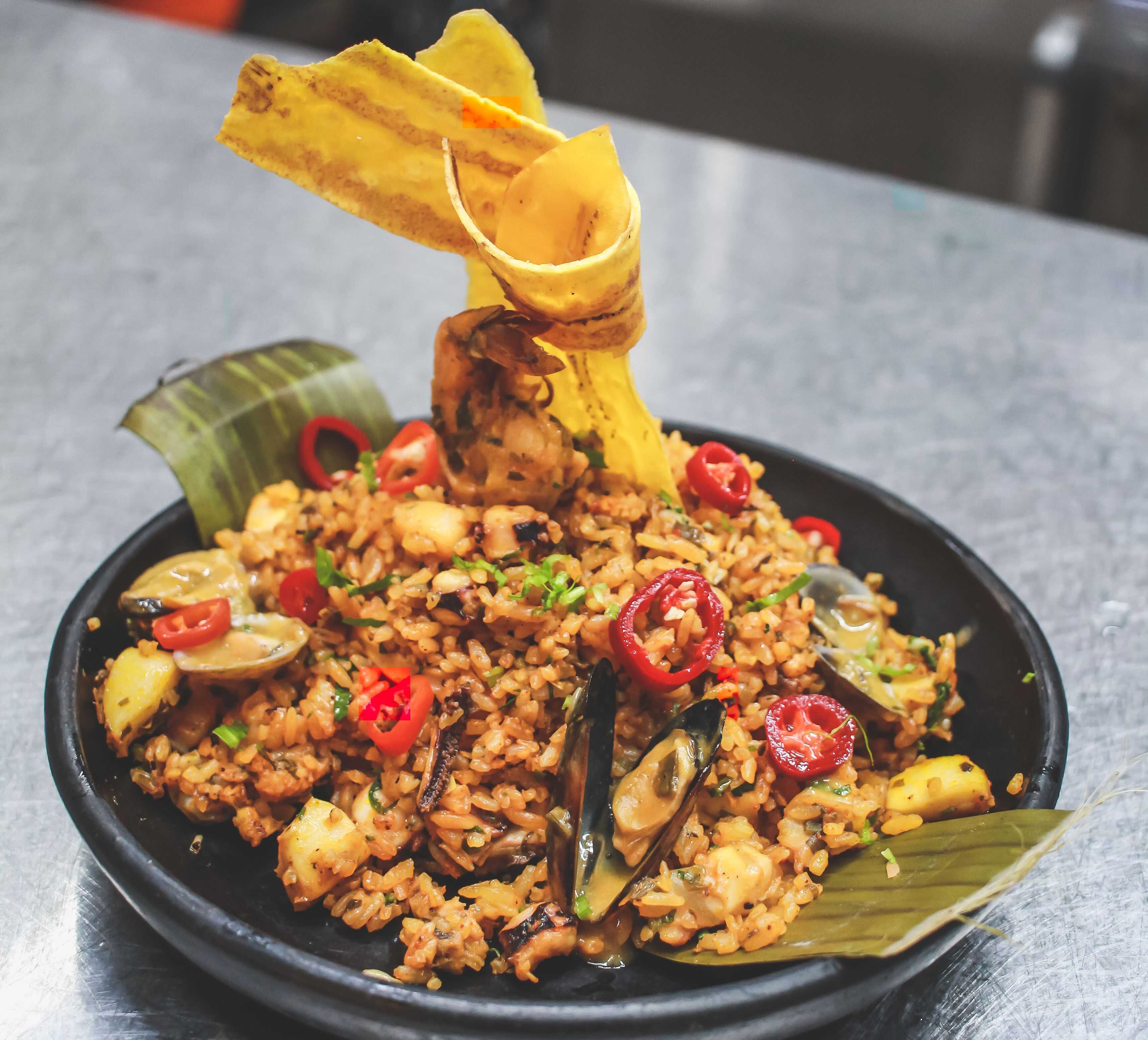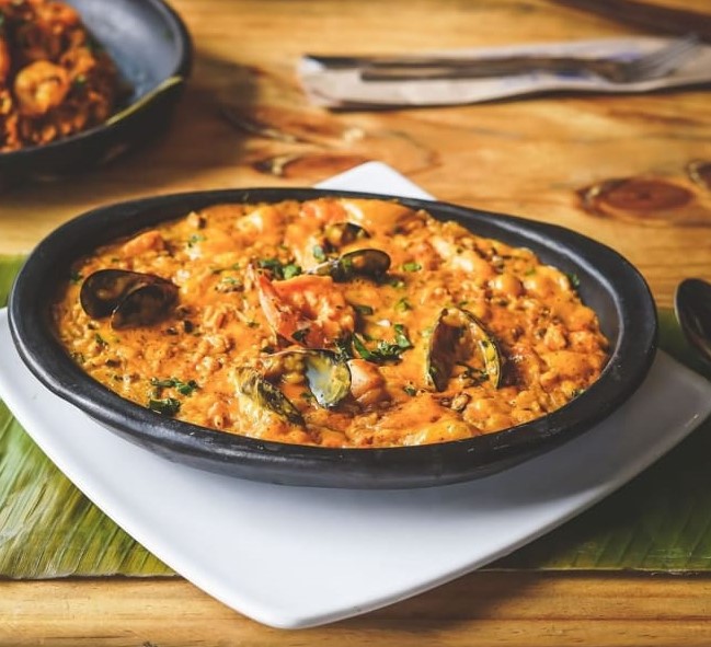 Exquisito arroz sazonado con el sabor del pacifico a base: camaron, calamar, pulpo, mejillones , acompañado con sancocho de pescado.