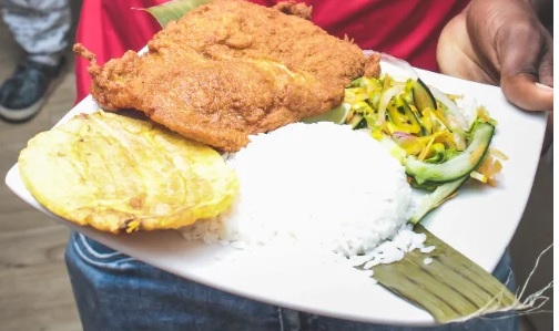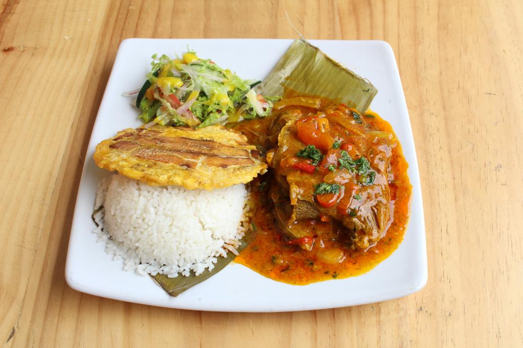 Acompañada de arroz blanco o arroz coco, patacón y ensalada.
