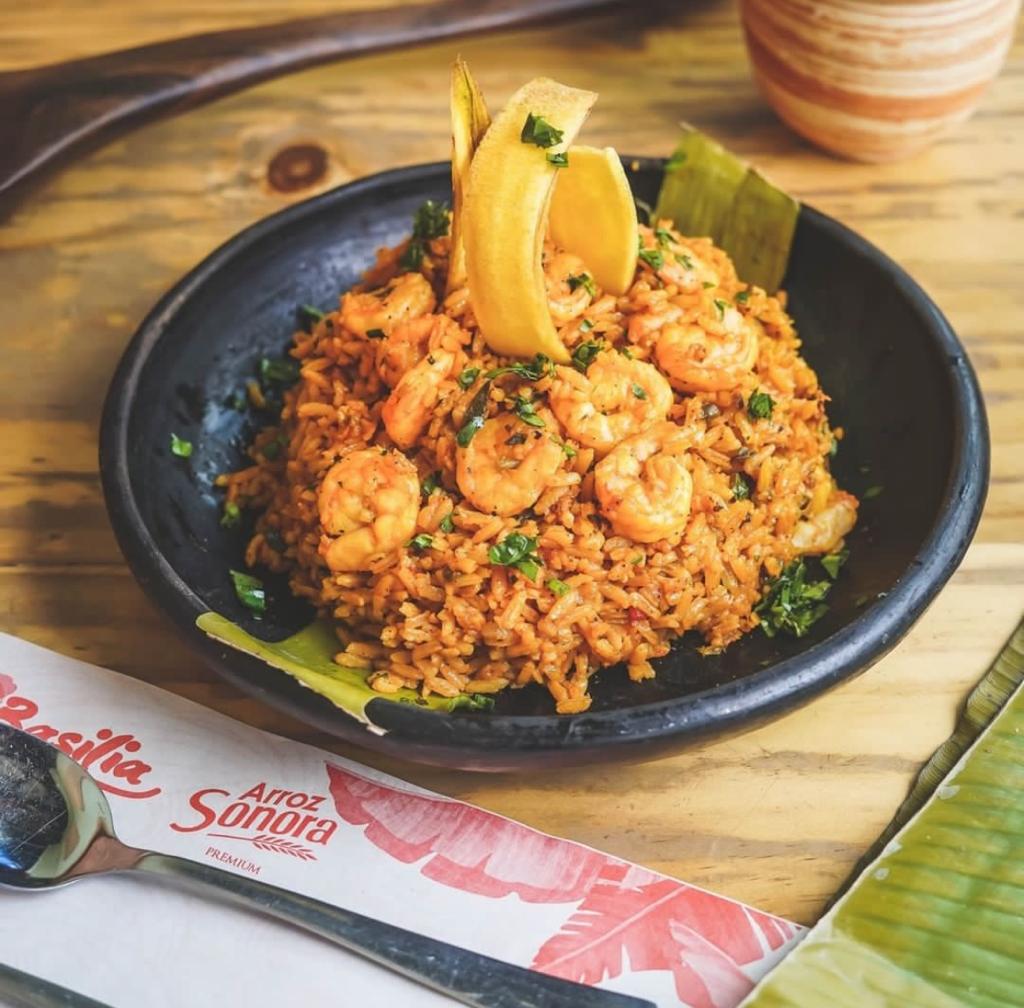 Exquisito arroz con camarones sazonado con el sabor del pacifico, acompañado de sancocho de pescado.