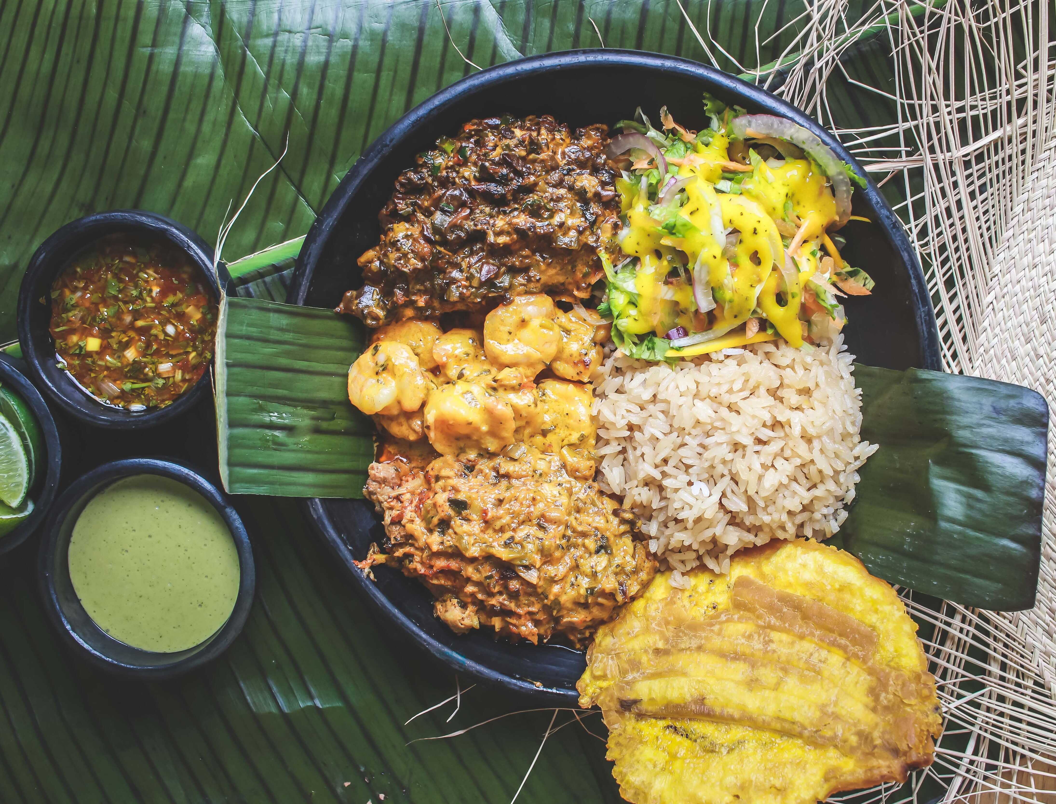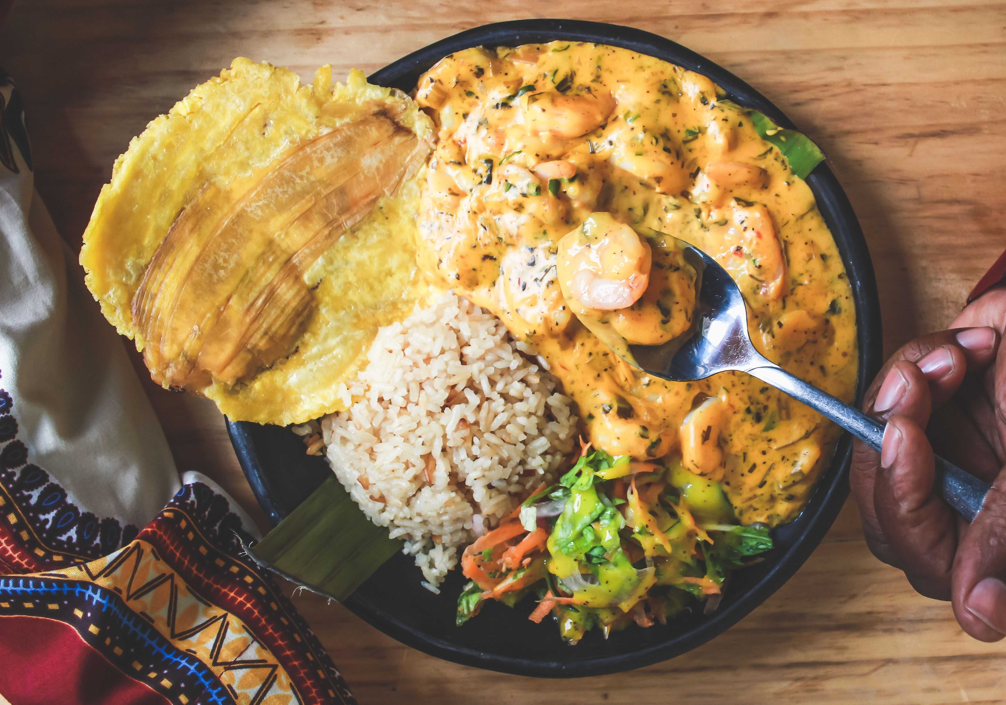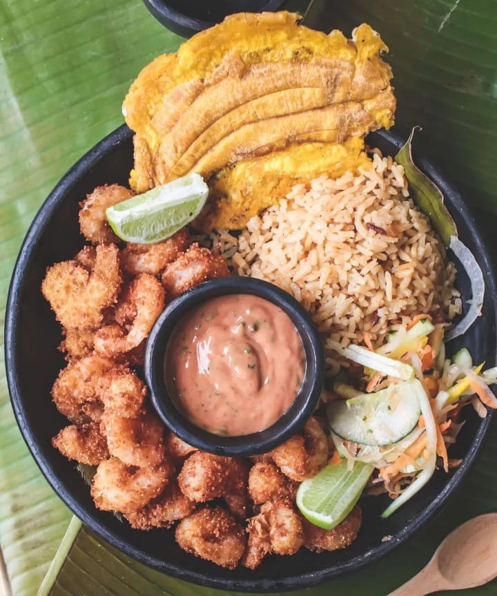 Sudado de Camarones en salsa de coco con hierbas de azotea, acompañada de sancocho de pescado, arroz coco o arroz blanco, Chips de platano y ensalada.