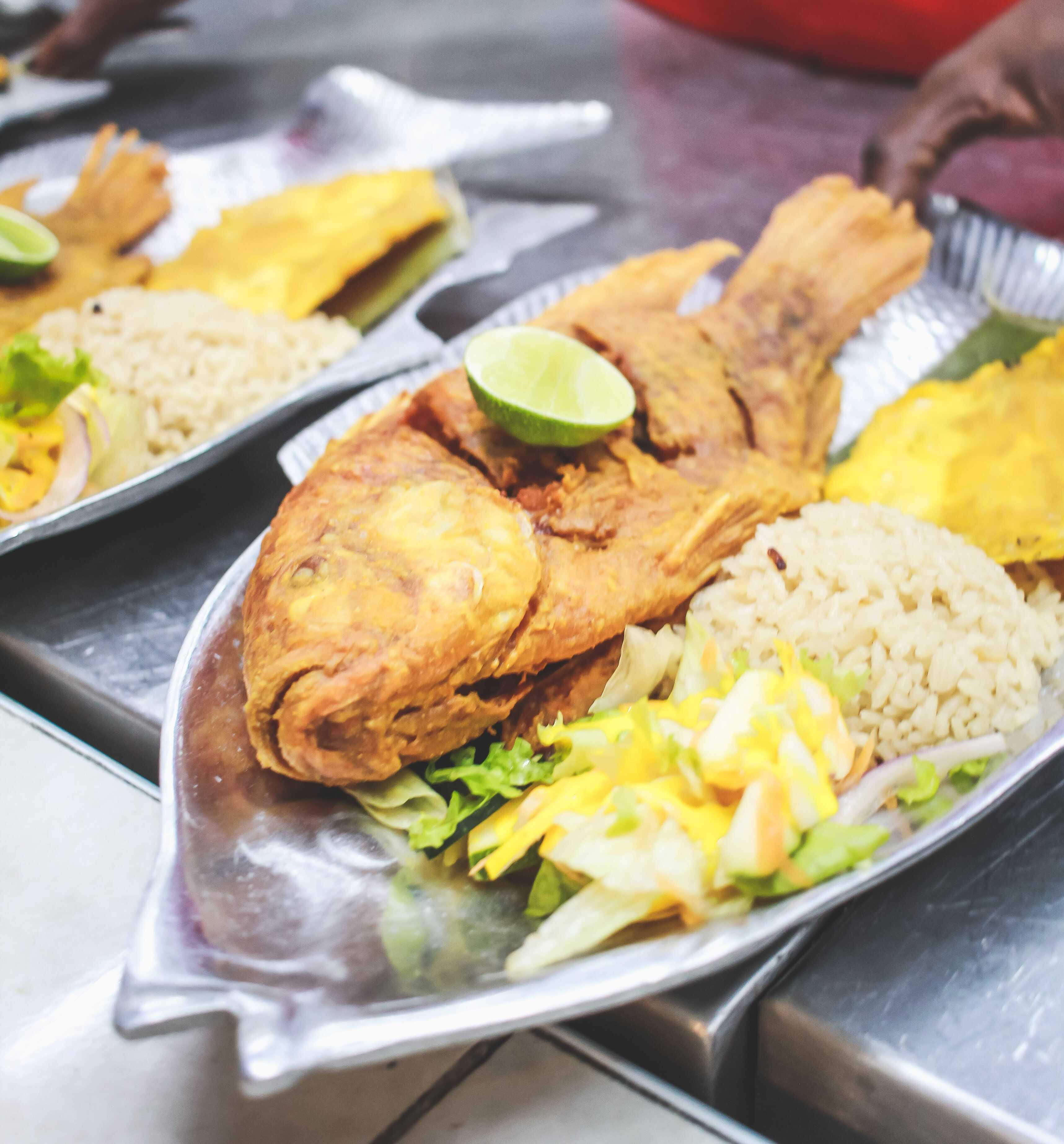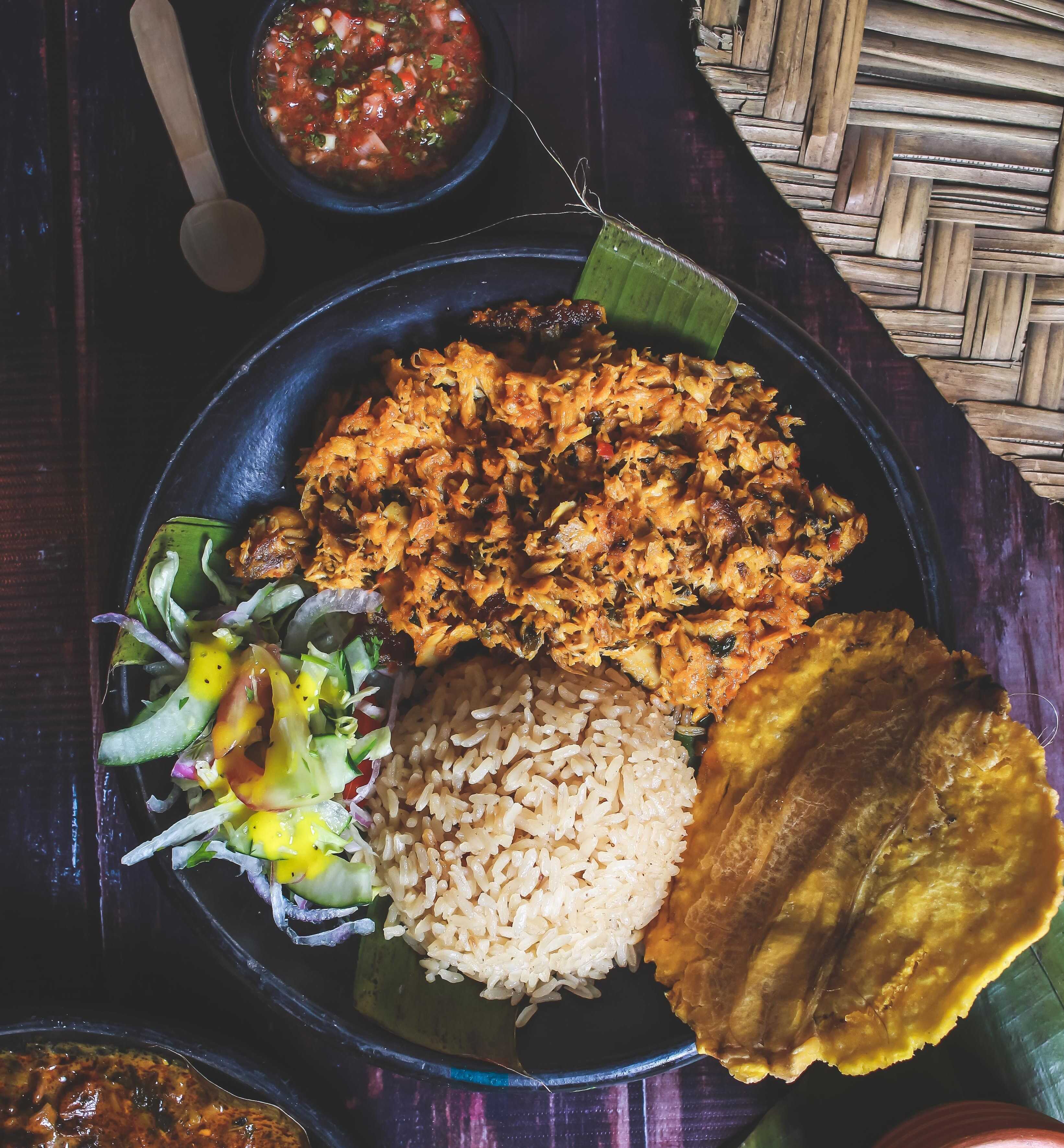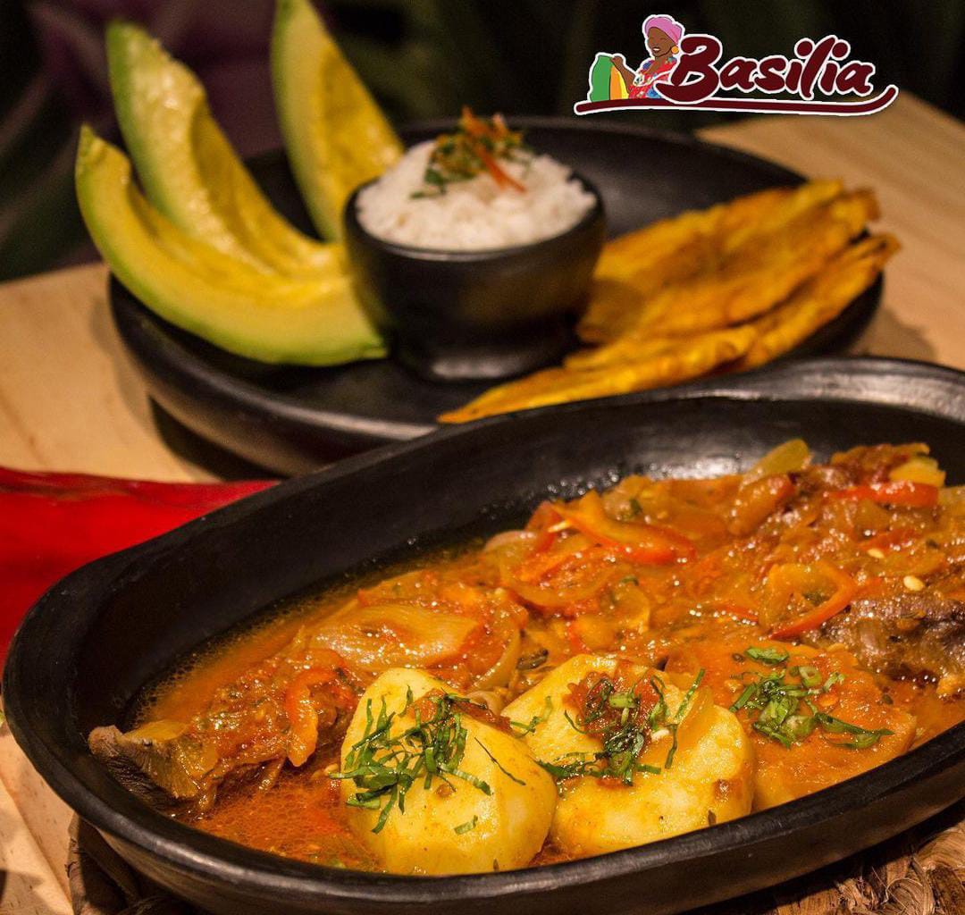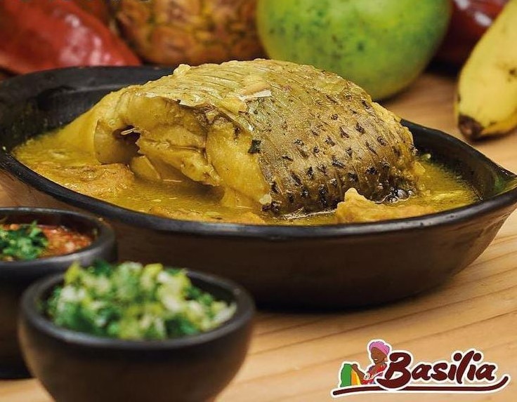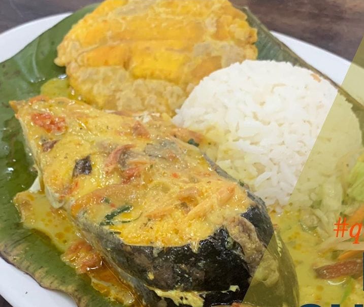 Sudado de pescado ahumado camarón y jaiba, acompañada de sancocho de pescado, arroz coco o arroz blanco, Chips de platano y ensalada.