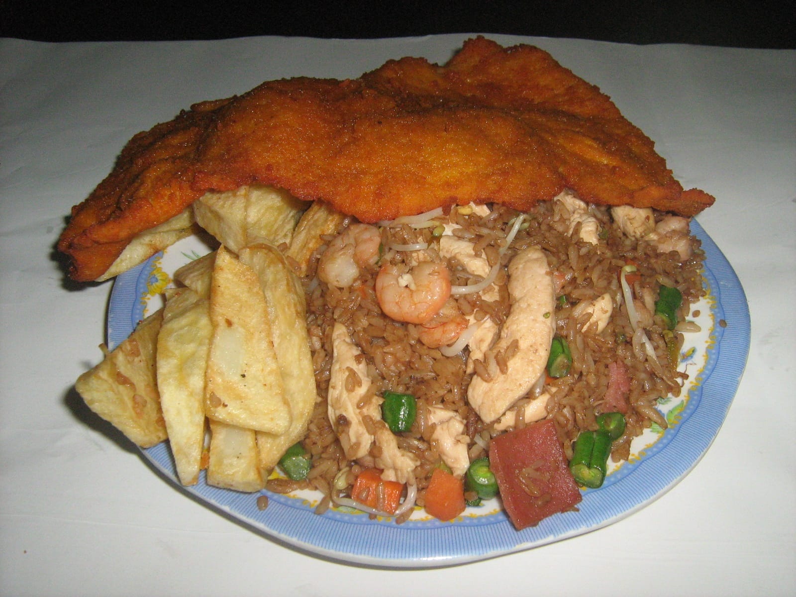 Delicioso arroz chino con trozos de pollo, jamón, camarón, habichuela, zanahoria y raíces, acompañado de papas a la francesa.