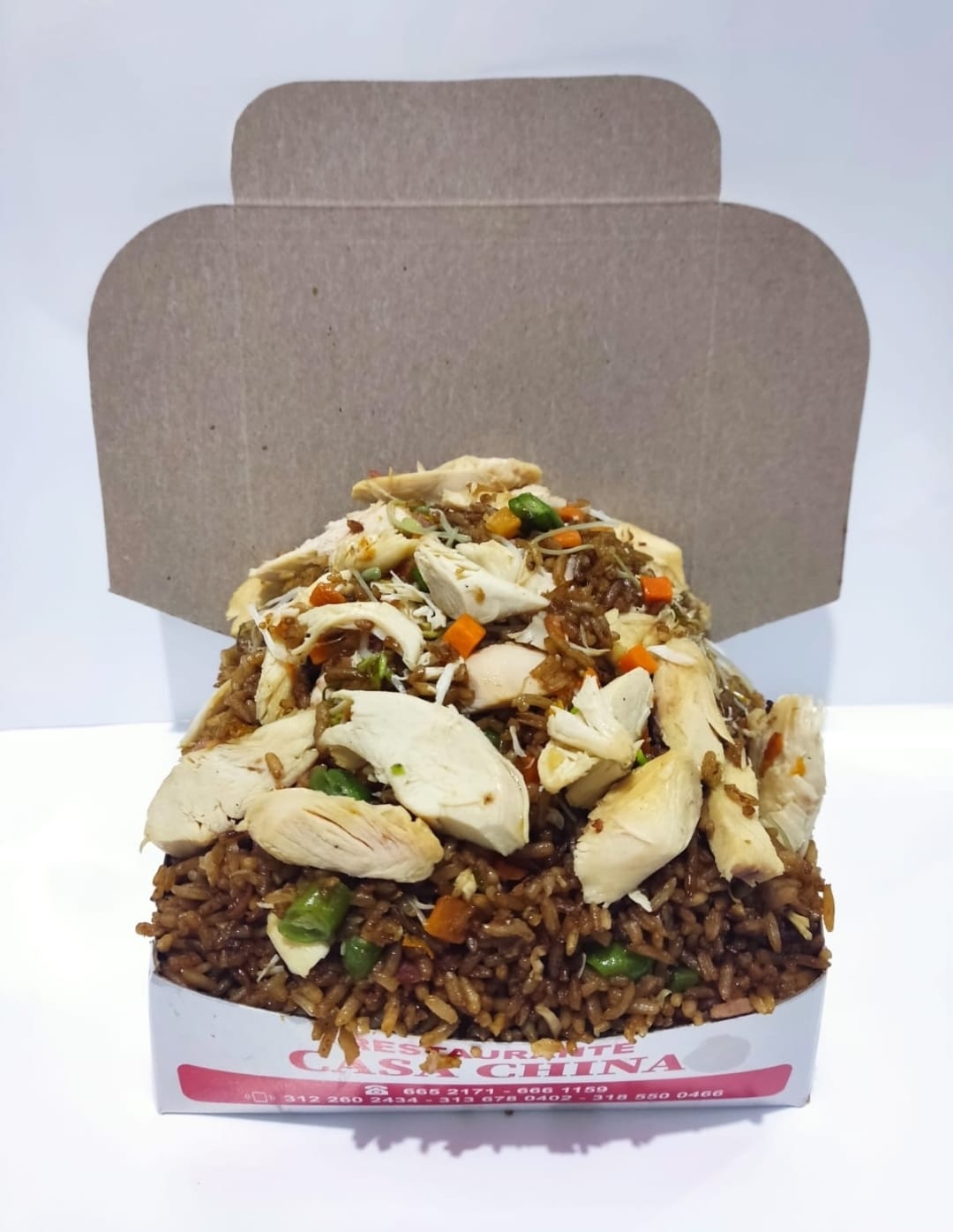 Para dos personas, delicioso arroz chino, con más carnes y verduras, pollo en trozos, jamón, habichuela, zanahoria y raices chinas, acompañado de chuleta de pollo.