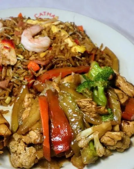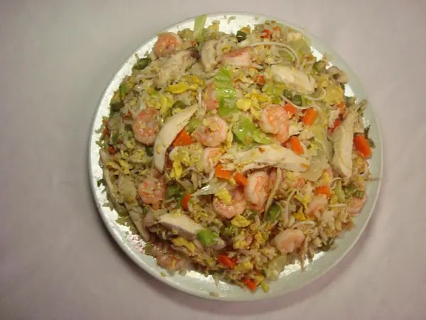 Arroz chino con pollo, jamón, cerdo, camarón, zanahoria, habichuela, raíz china, chopsuey, papas y salsa agridulce