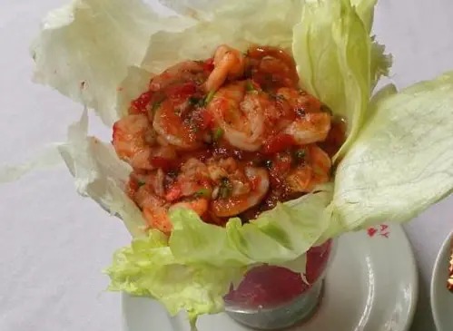 Ceviche con camarones, tomate, cebolla, salsa de tomate, limón, cilantro.