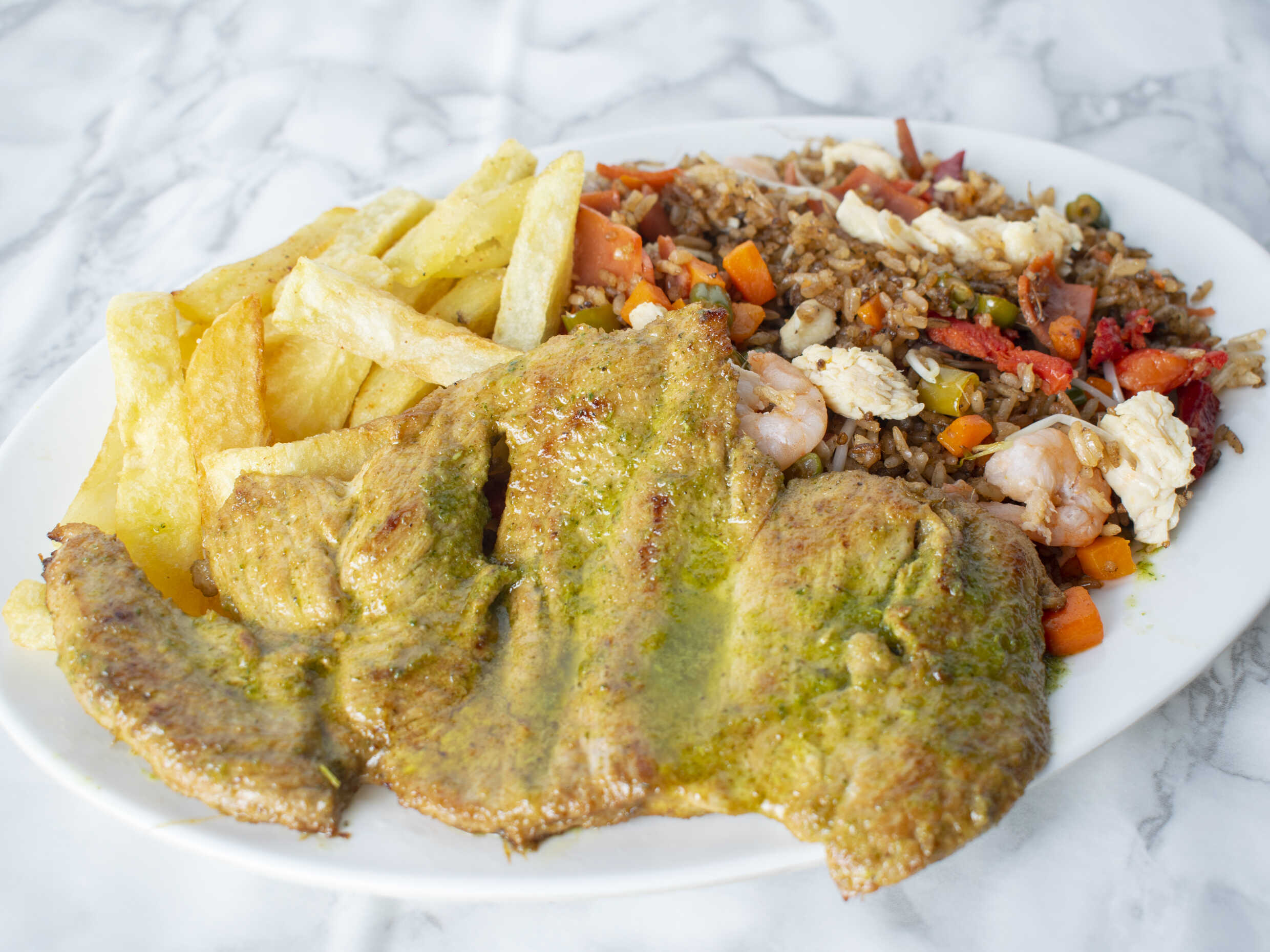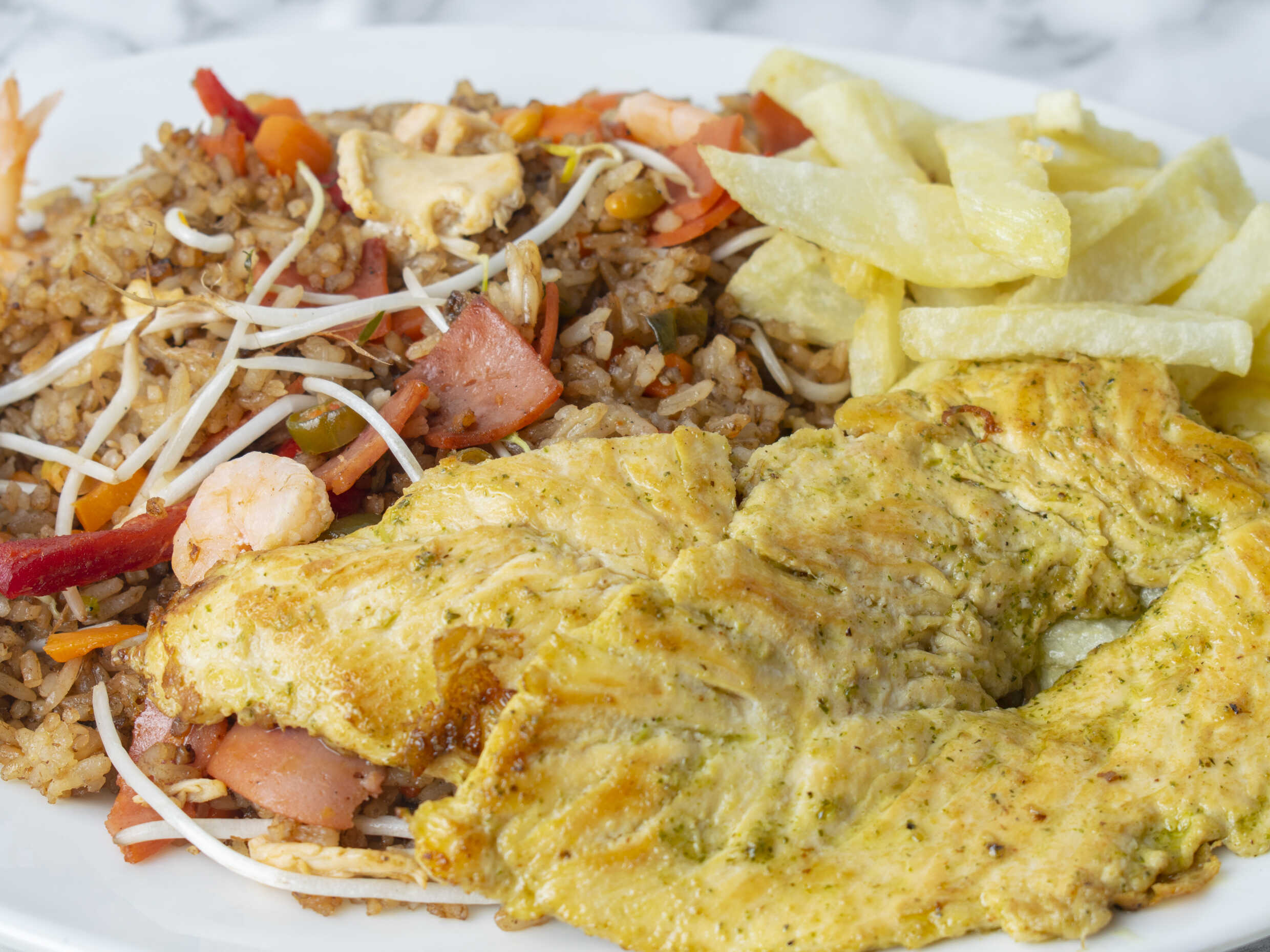 Arroz con verduras, raíces chinas, costilla, camarón, jamón y pollo, acompañado de filete de pollo.