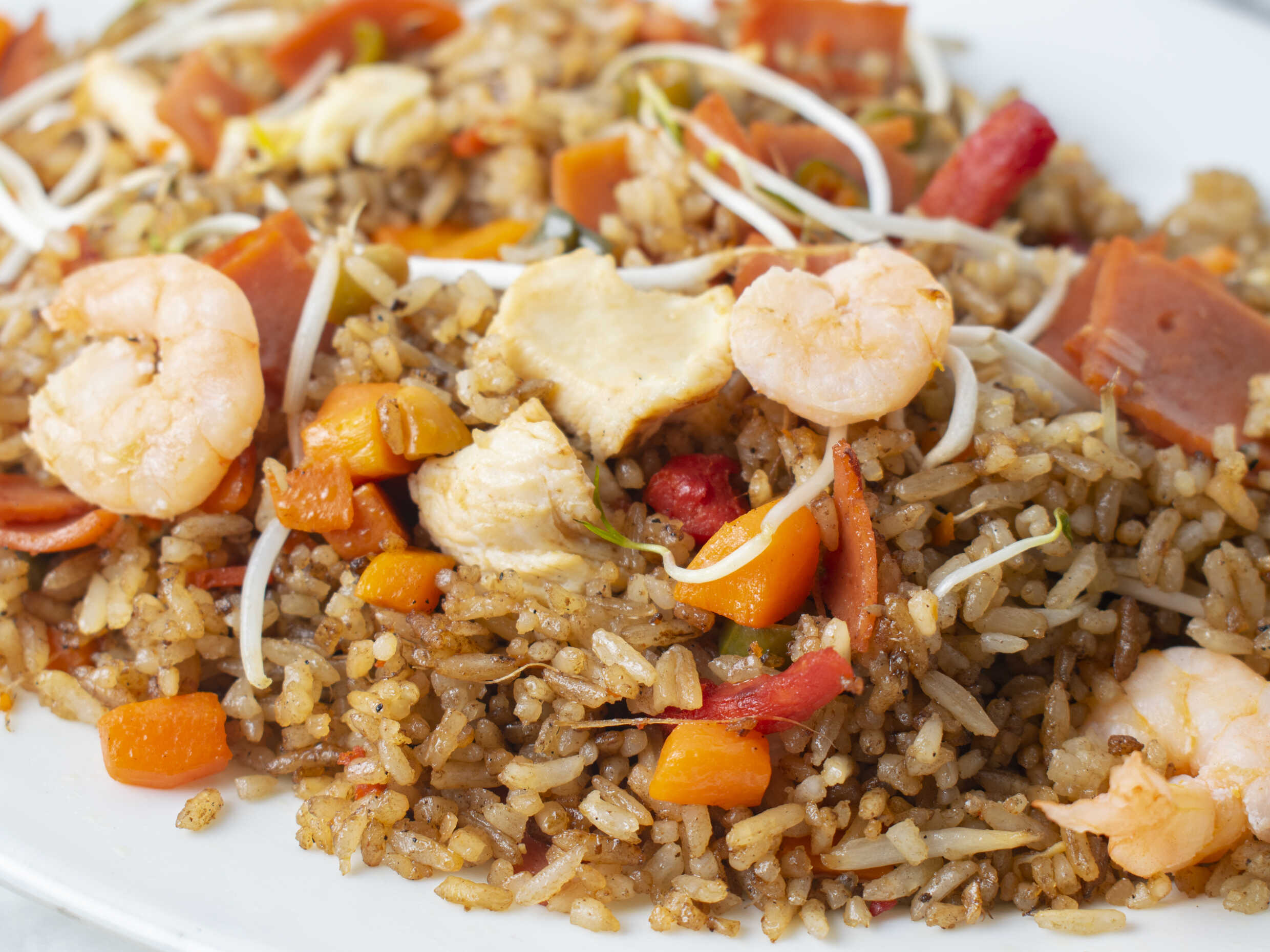 Arroz con verduras, raíces chinas, jamón, costilla, camarón y pollo.