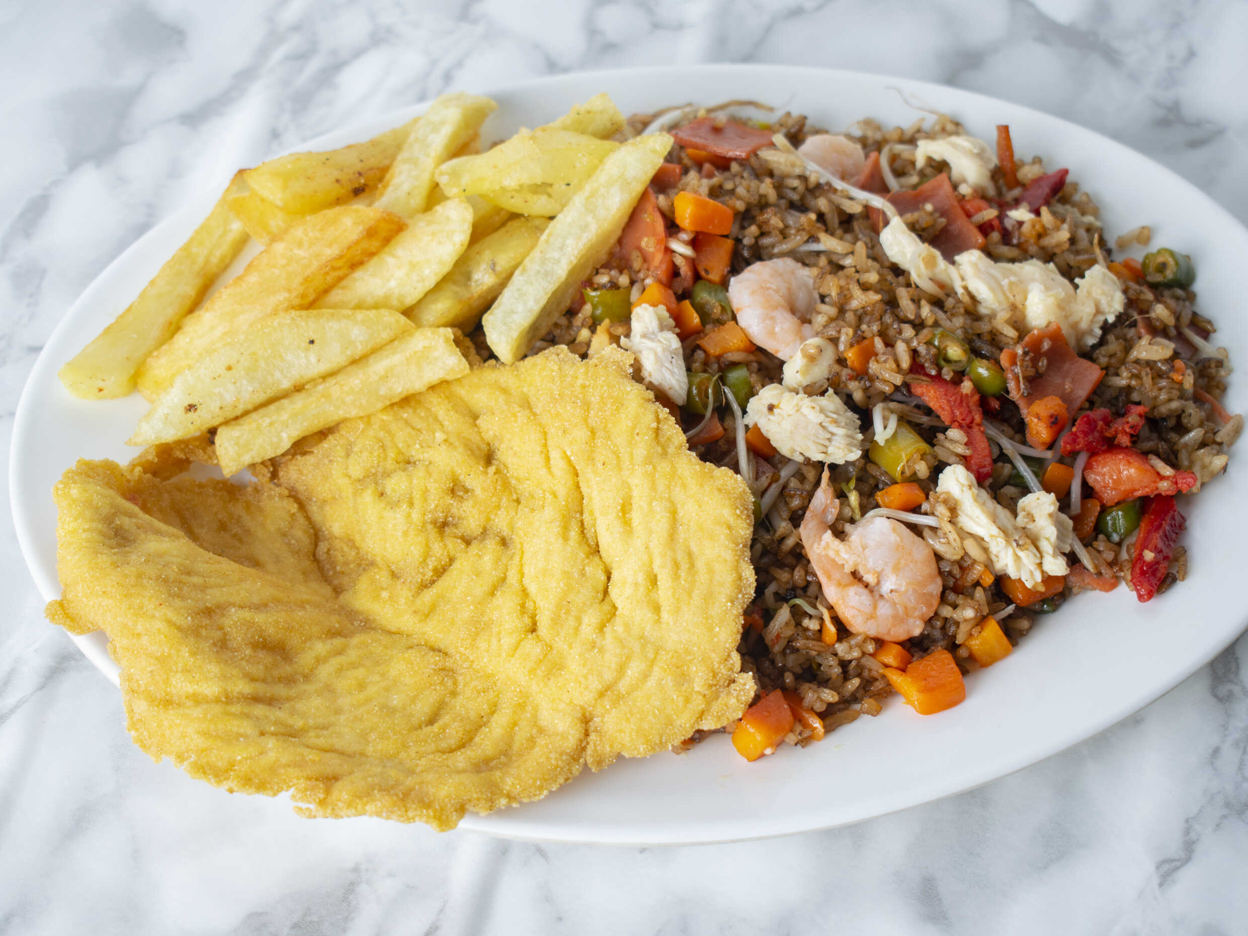 Arroz con verduras, raíces chinas, costilla, camarón, jamón y pollo, acompañado de chuleta frita.