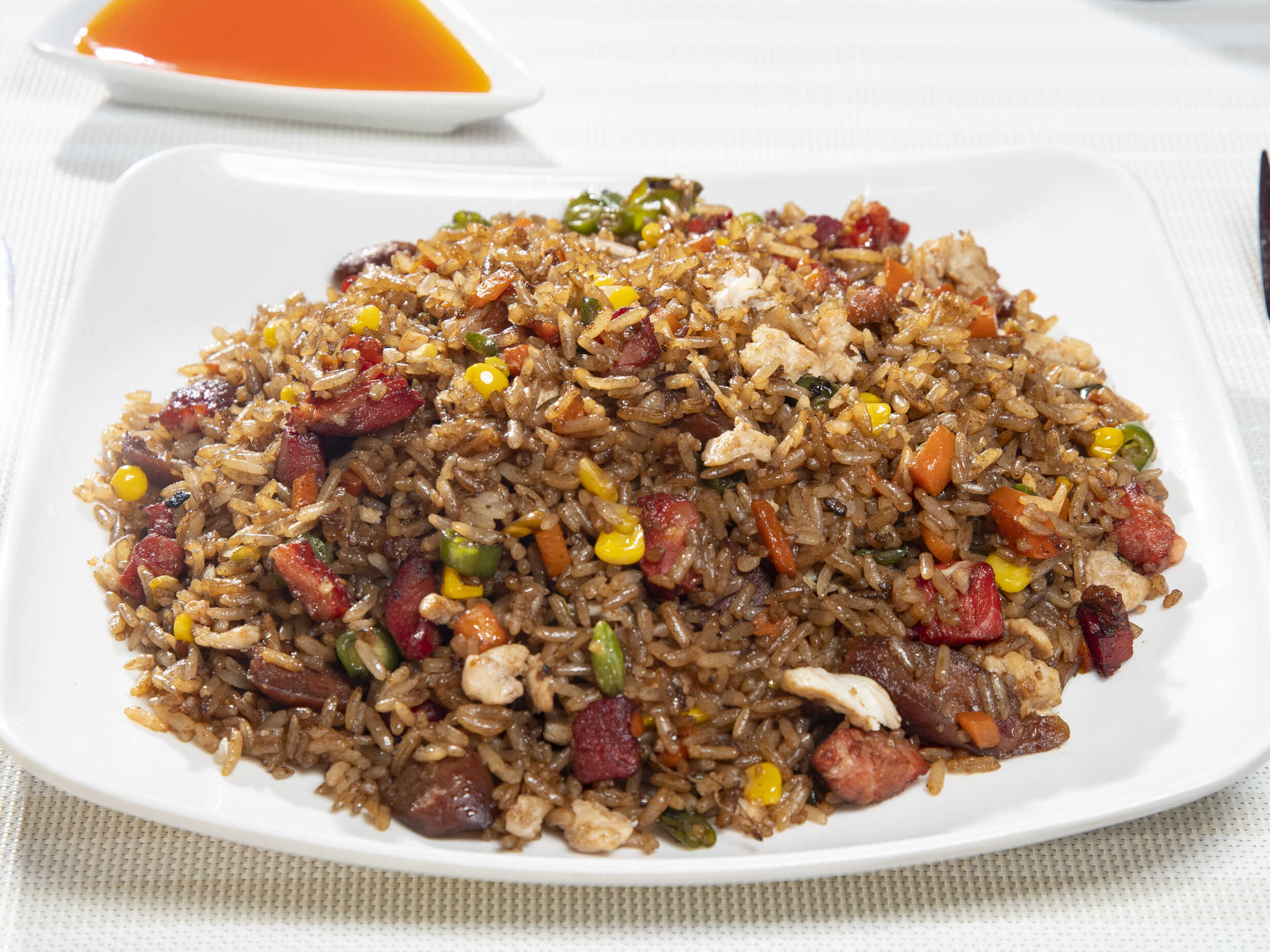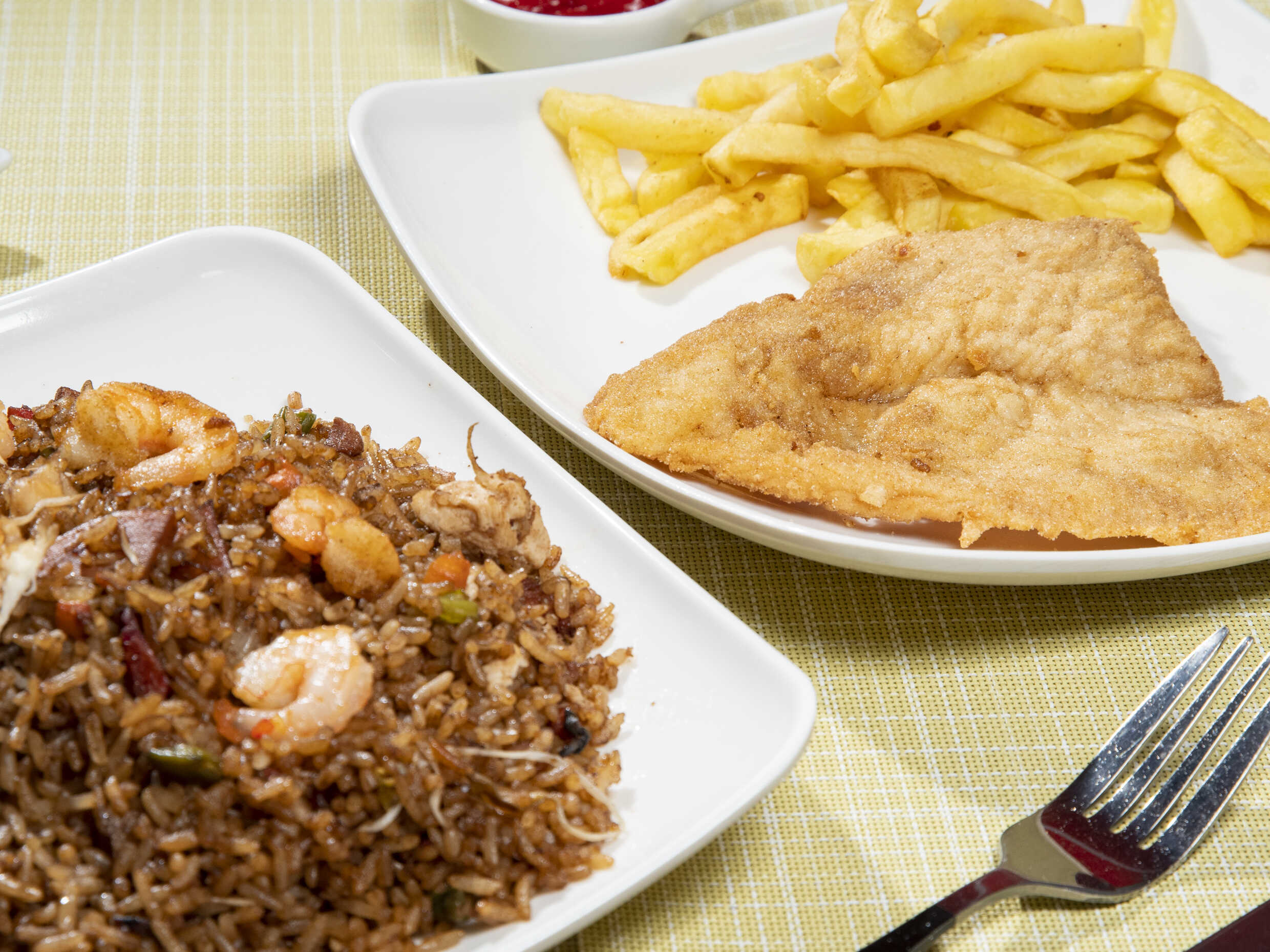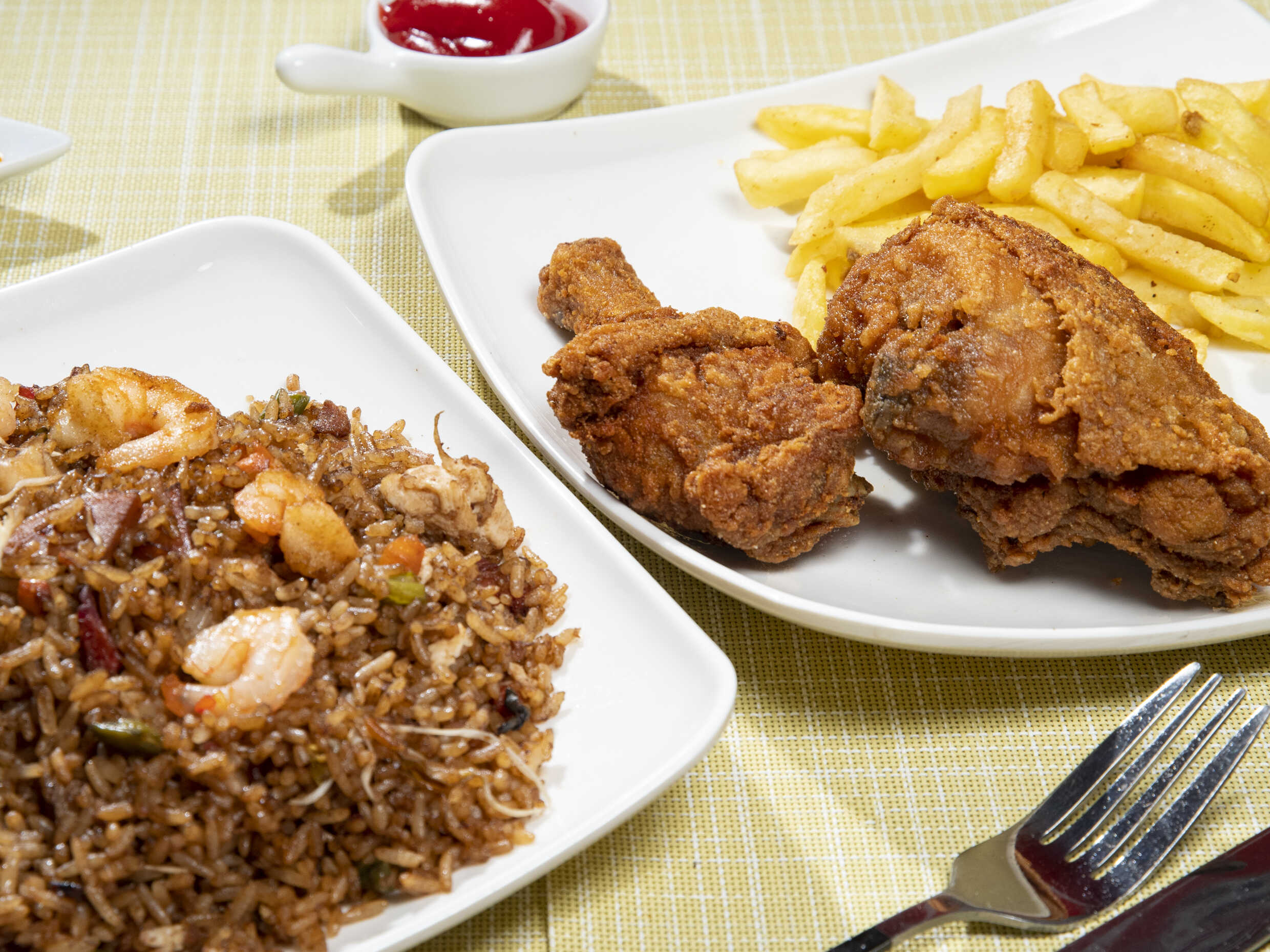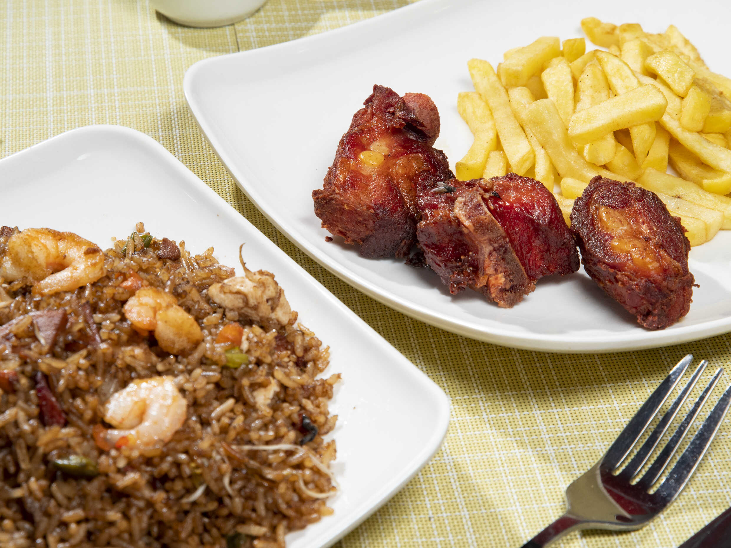Arroz, pollo, cerdo, jamón, camarón, chuleta, zanahoria, habichuela y raíz china. Acompañado de Chuleta y Papas a la Francesa para Dos personas
