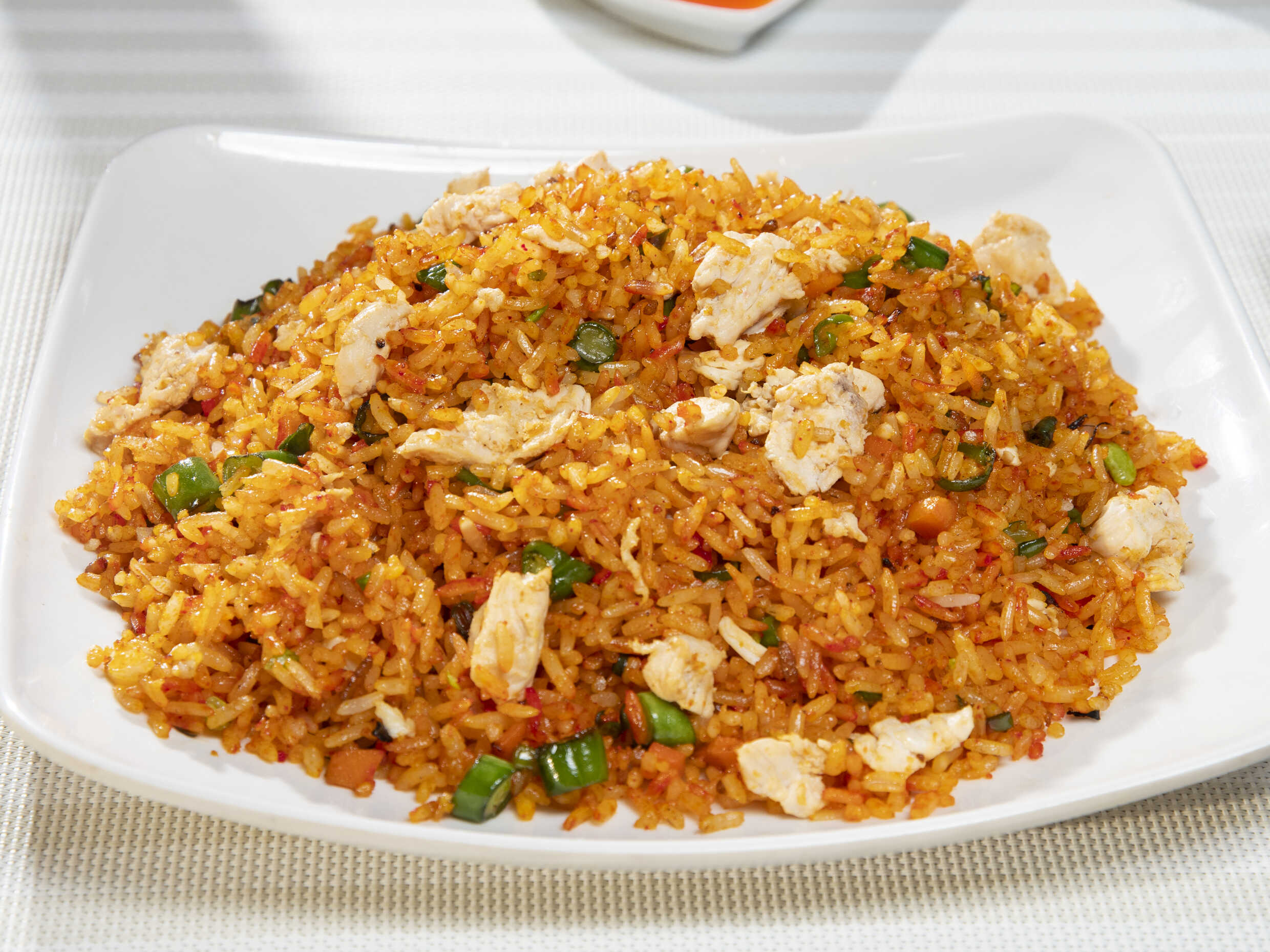 Arroz, pollo, cerdo, jamón, camarón, zanahoria, habichuela y raíz china más 3 presas de pollo apanado.