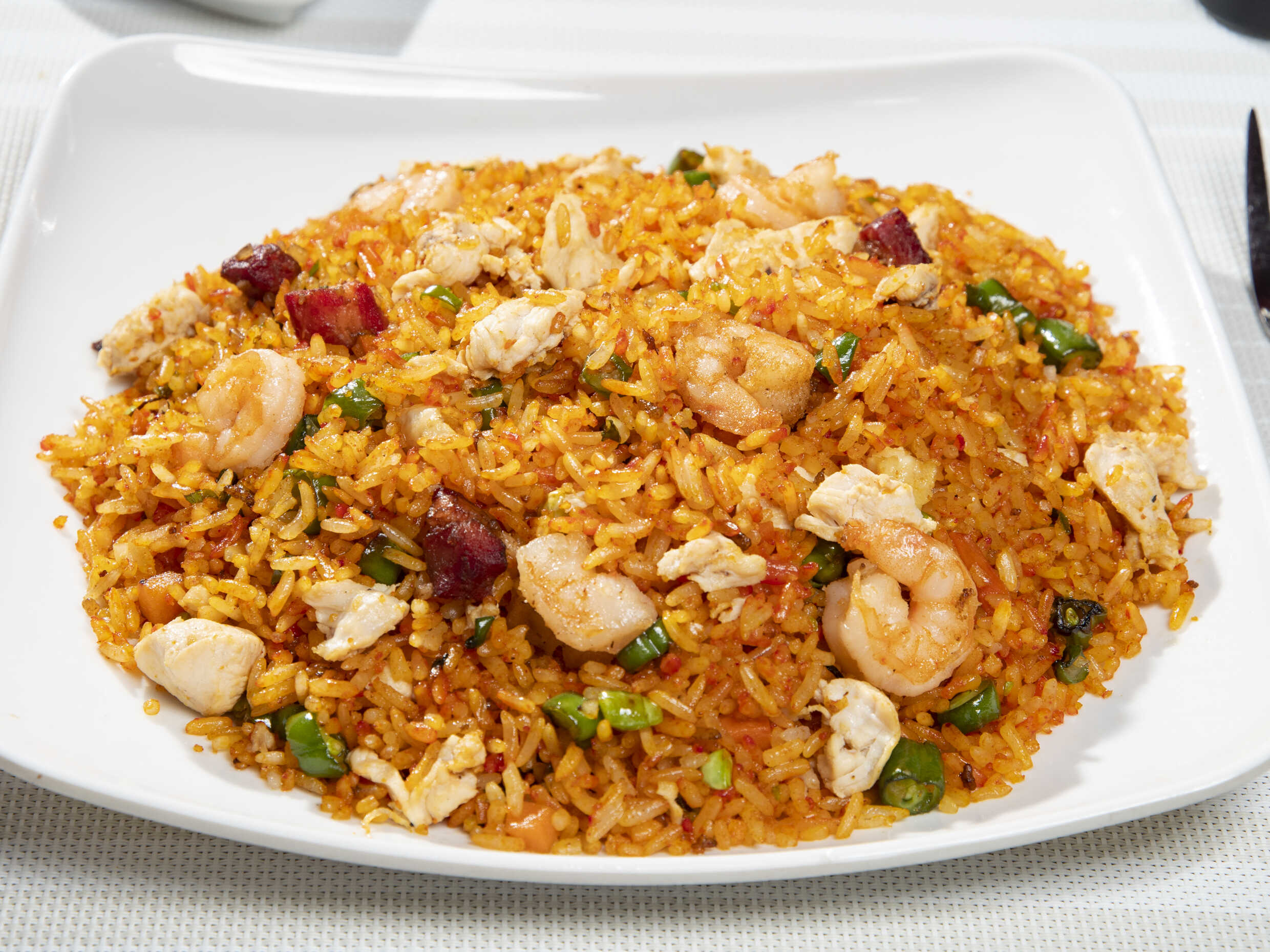 Pollo, cerdo, jamón, camarón, zanahoria, habichuela y arroz amarillo.