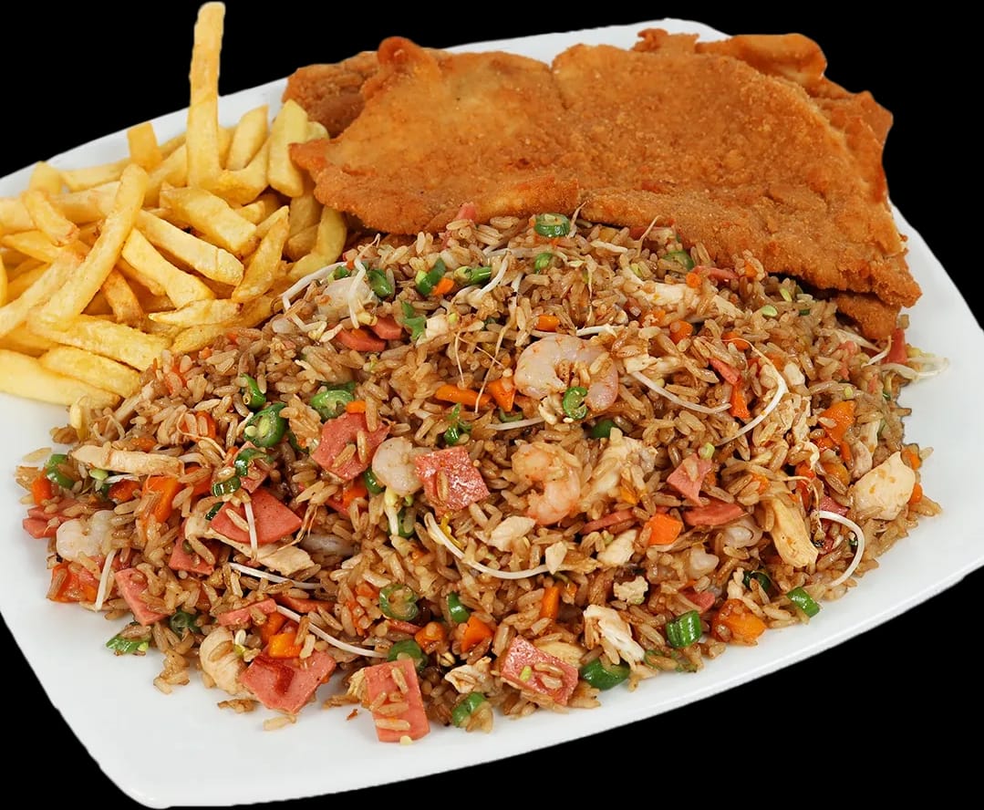 1100 gramos de arroz con trozos de pollo, jamón, camarones, verduras mixtas de zanahoria, habichuela y raíces chinas con chuleta.