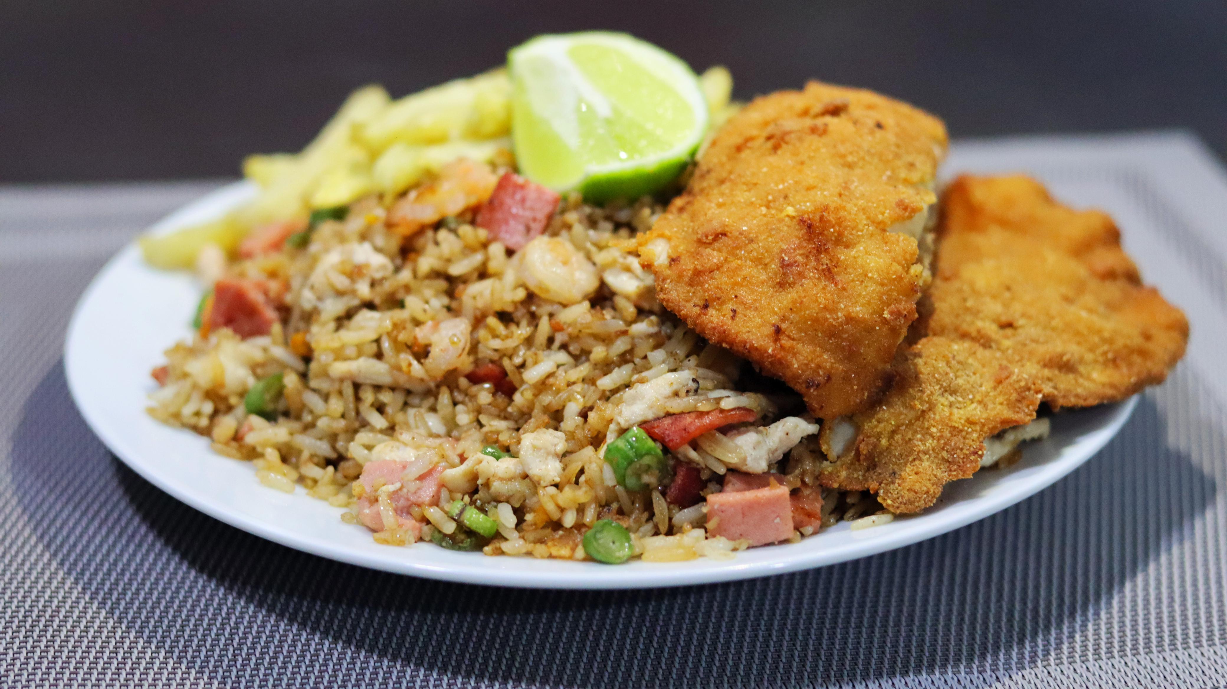 500 gramos de arroz, camarón, pollo, jamón, verduras mixtas de zanahoria, habichuela y raíces chinas.