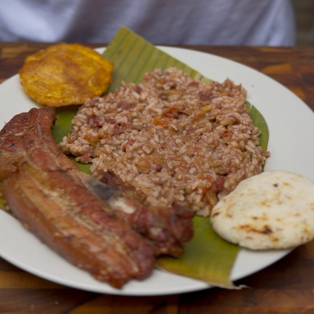 costilla de cerdo al barril/ acompañada con arroz blanco, papa rústica, ensalada fresca, guacamole / sancocho de gallina.