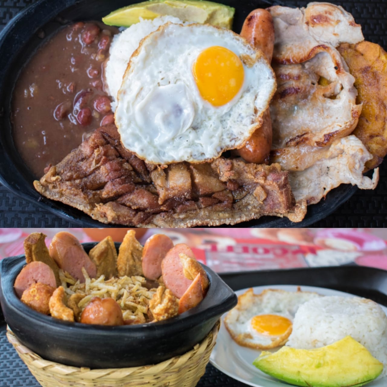 frijoles, arroz, chicharrón, huevo, carne molida, carne de cerdo, chorizo, aguacate, arepa, ensalasa y maduro frito.