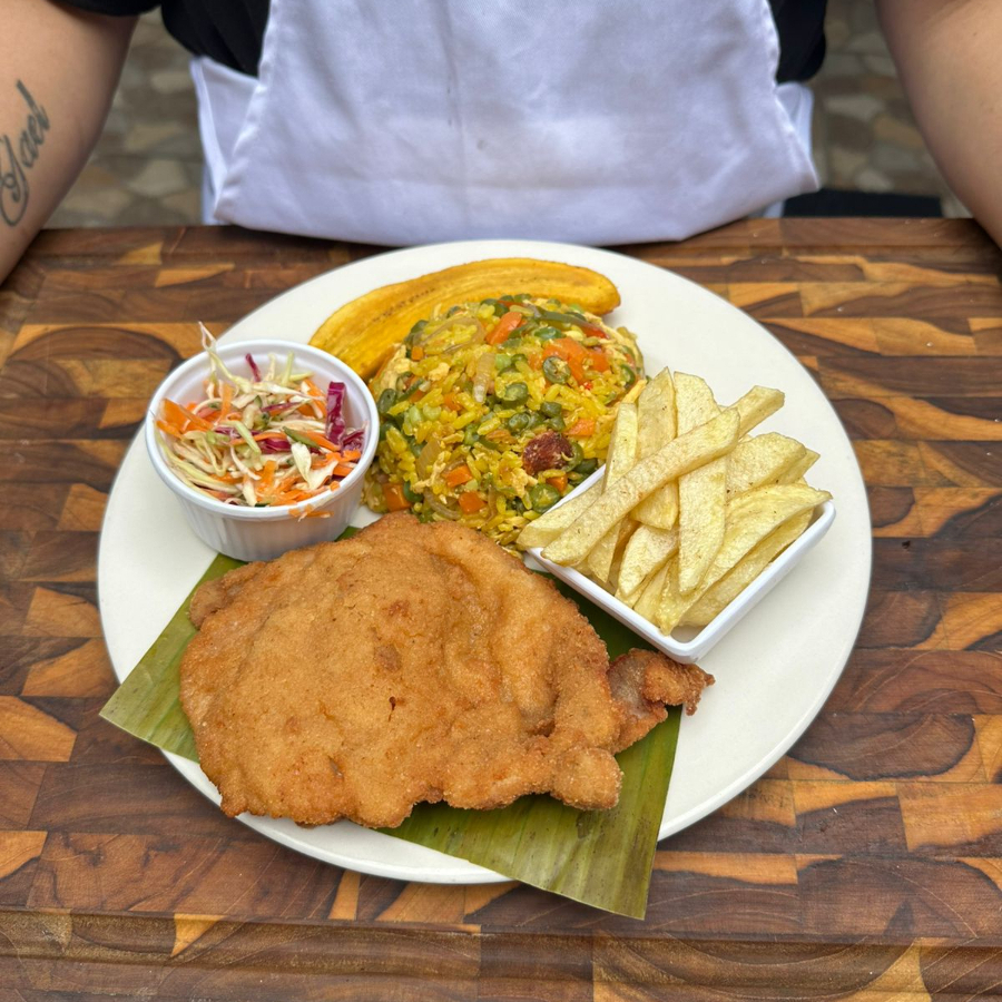 chuleta valluna /cerdo/pollo/ acompañada con arroz blanco, maduro frito, ensalada fresca, sopa del día, principio del día.