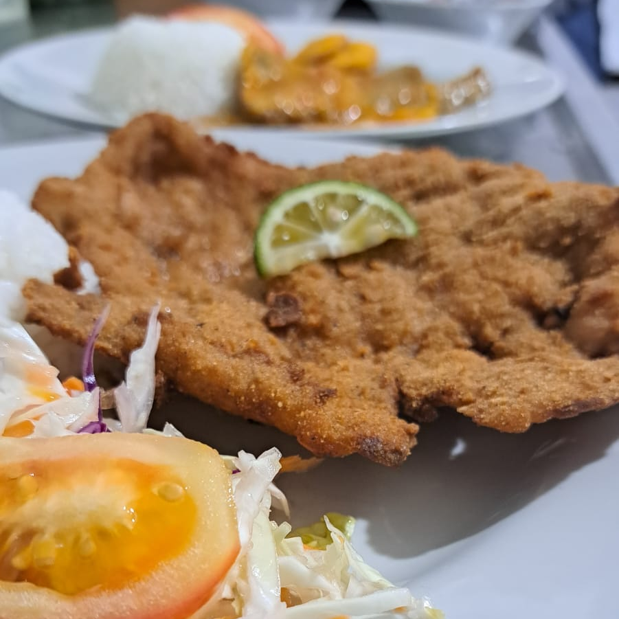 Chuleta valluna - plato típico vallecaucano. Carne de cerdo o pechuga de pollo (empanizada con harina de pan , hierbas , huevo , leche , especias) acompañada con arroz blanco , tostada de platano y ensalada ( lechuga batavia, zanahoria , vinagreta) , Sancocho de gallina. + limonada fria