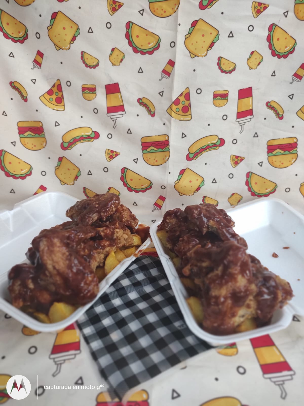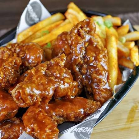 Alas con salsa BBQ de la casa acompañada de porción de papa frita.