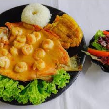 Trucha con Camarones acompañado de sancocho de pescado, patacón y ensalada de la casa.