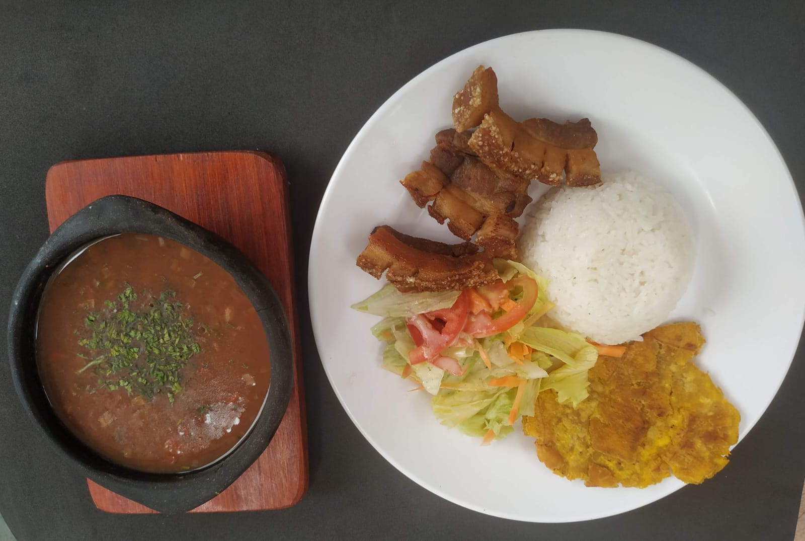 Trucha al ajillo acompañado de sancocho de pescado, patacón y ensalada de la casa.