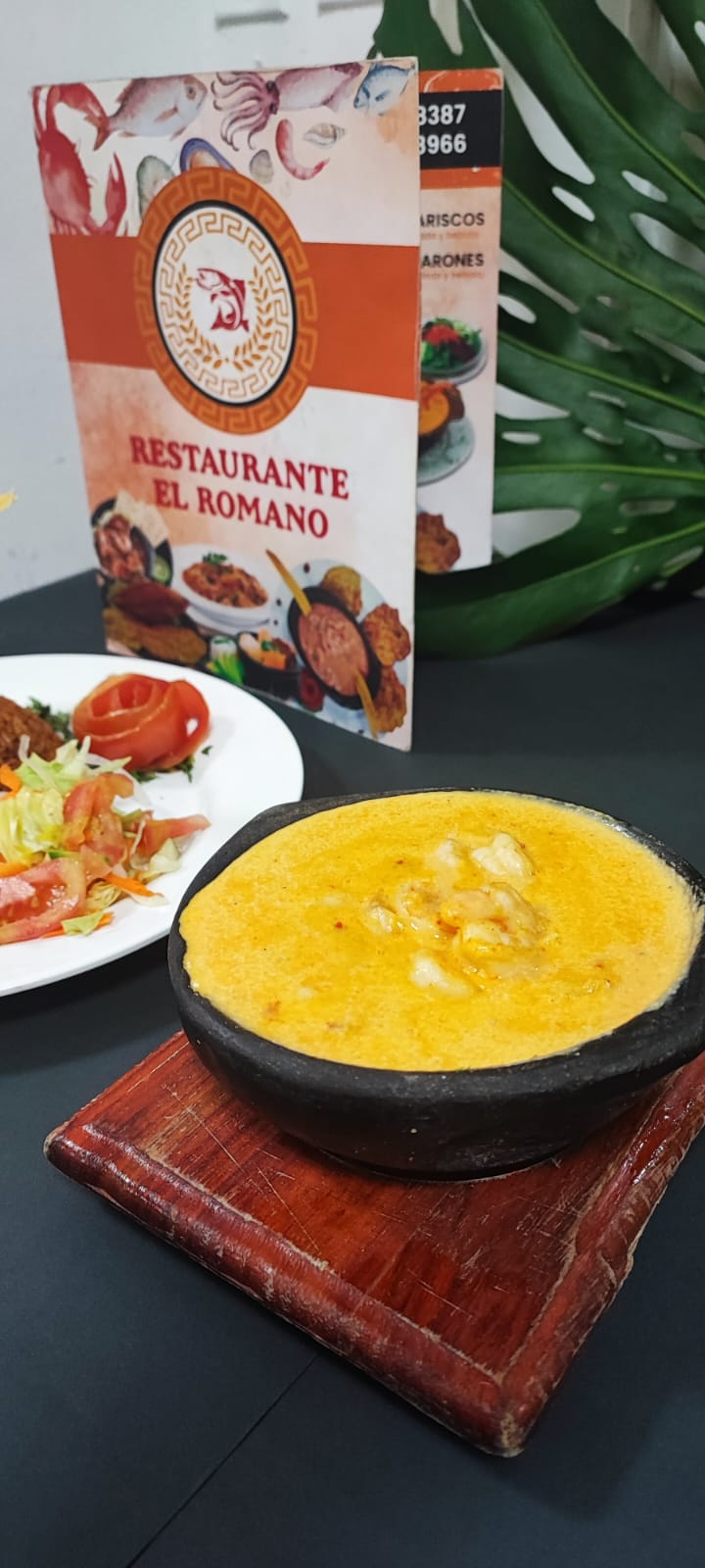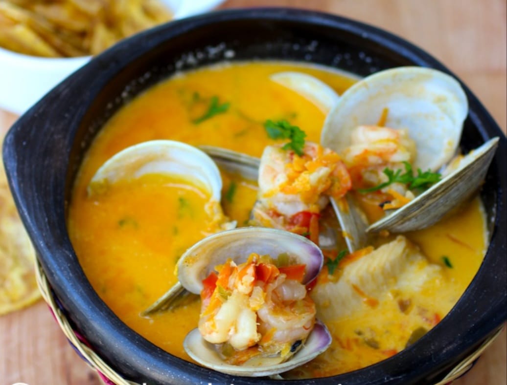 Cazuela de mariscos acompañada de patacón, arroz y ensalada de la casa.