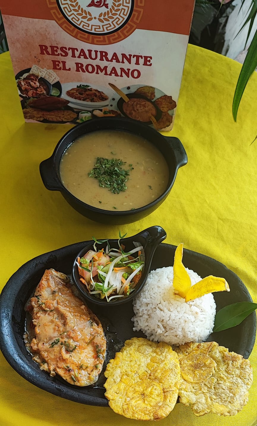 acompañado de sancocho de pescado, patacón y ensalada de la casa.