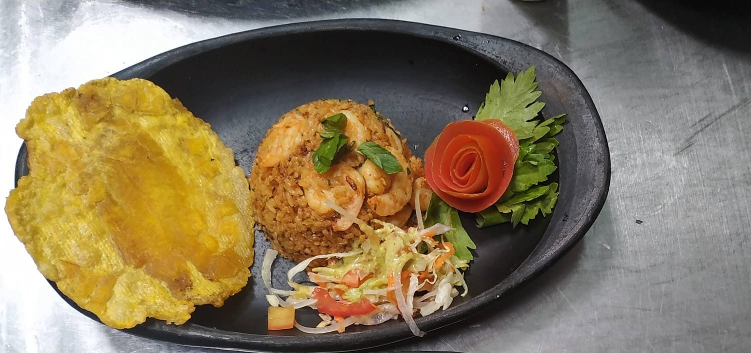 Arroz con camarones acompañado de sancocho de pescado, patacón y ensalada de la casa.