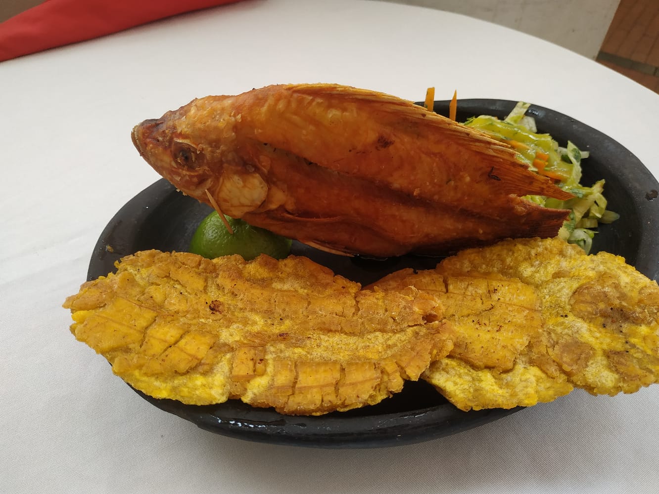Tilapia frita acompañado de sancocho de pescado, patacón y ensalada de la casa.