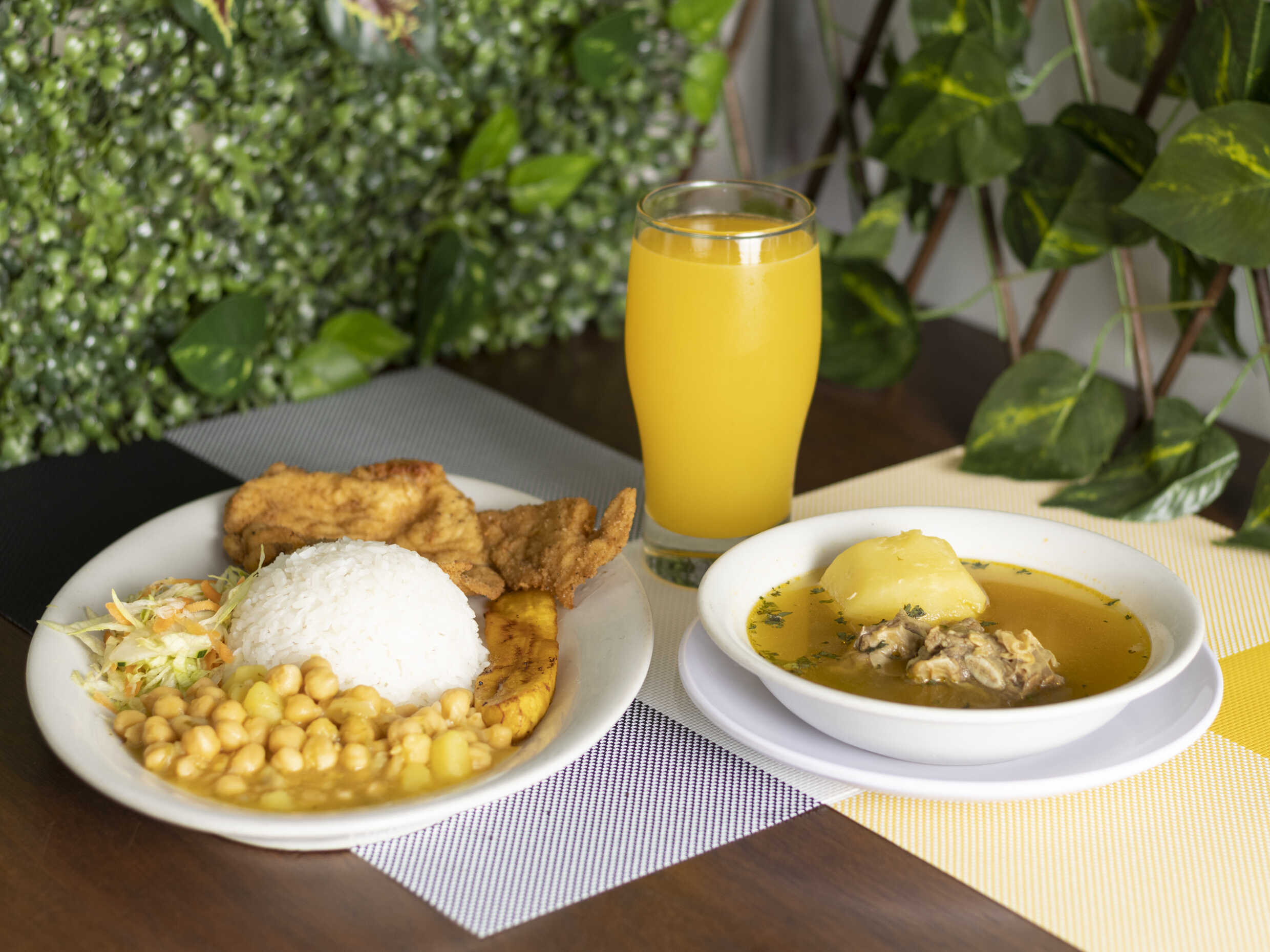 Almuerzo del dia opcion multiple (principio a eleccion). Incluye arroz blanco, guarnición, ensalada y jugo de 9 onzas.incluye sopa del dia 16 onzas (Platillo personal)