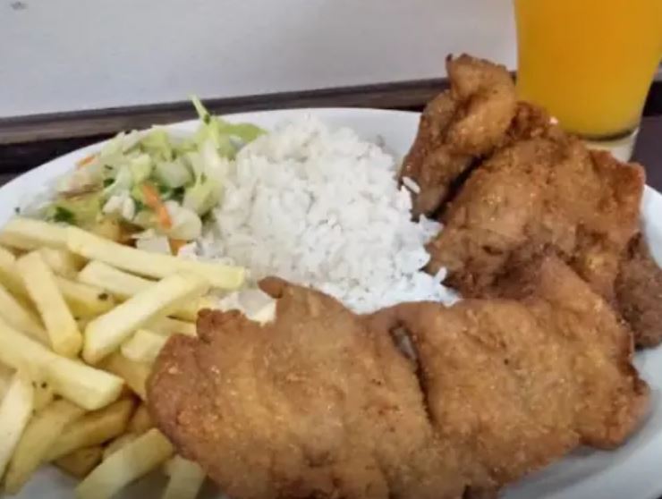 Milanesa de cerdo 100gr + milanesa de pollo 100gr acompañada de arroz, papas a la francesa, ensalada.