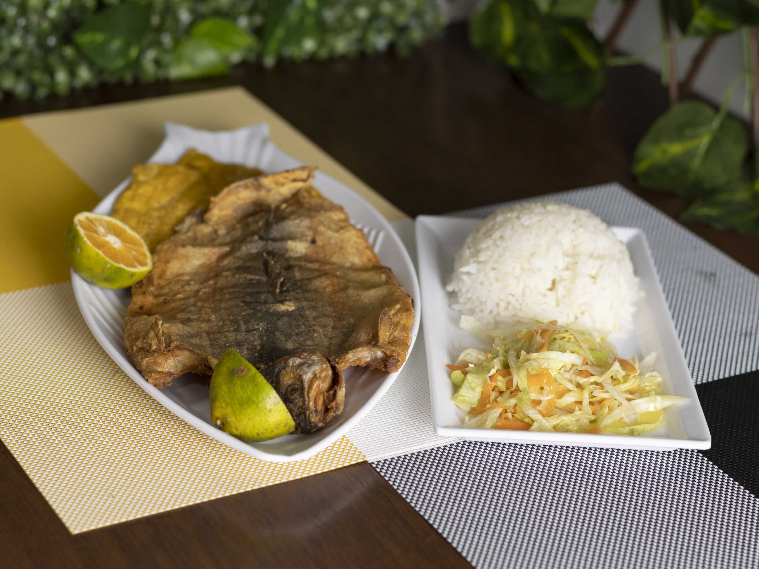 Filete de trucha Ahumada, acompañada de arroz, patacones, ensalada.