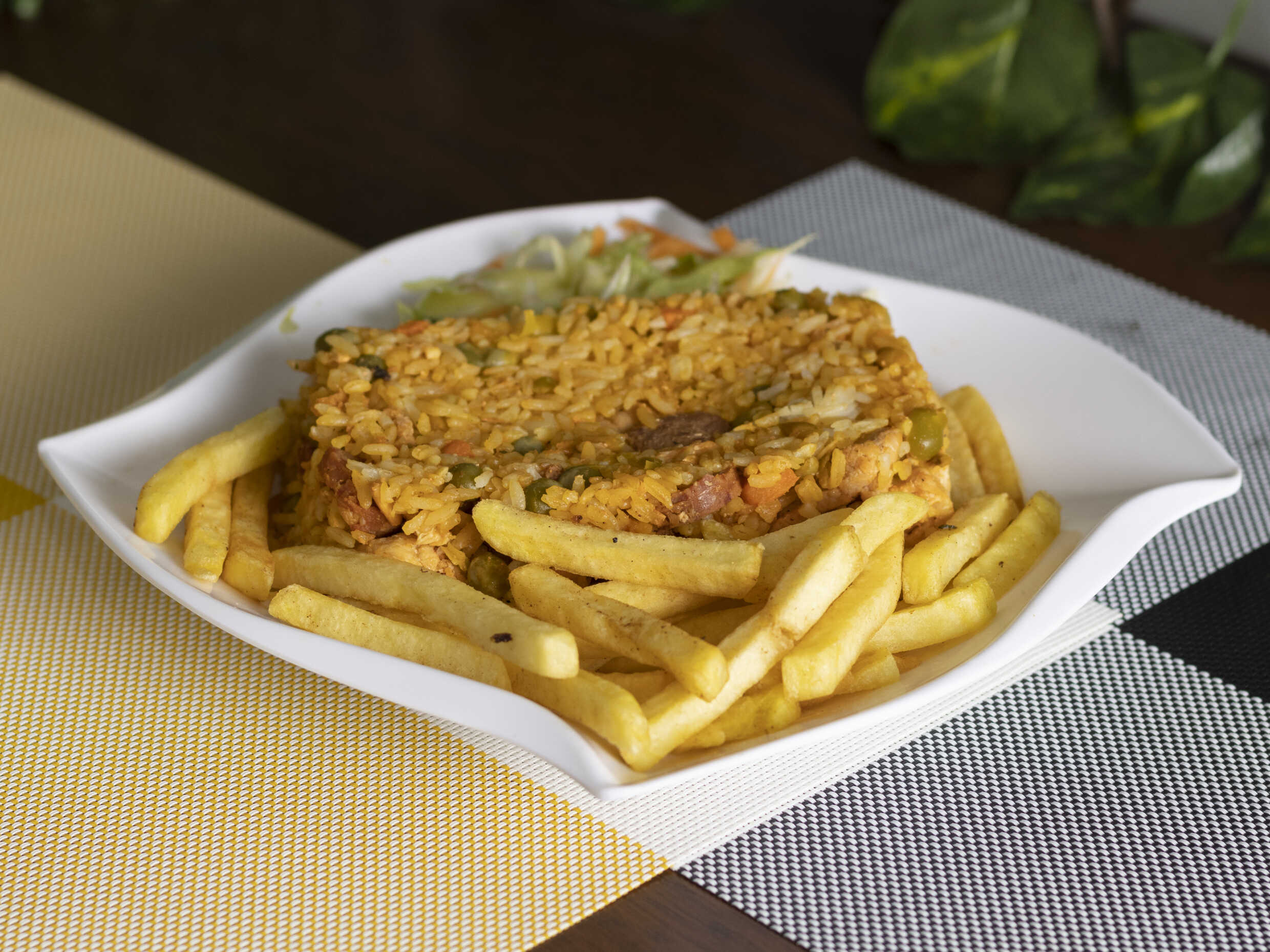 Arroz al wok con cerdo, pollo, chorizo, verduras acompañado de papas a la francesa, ensalada.
