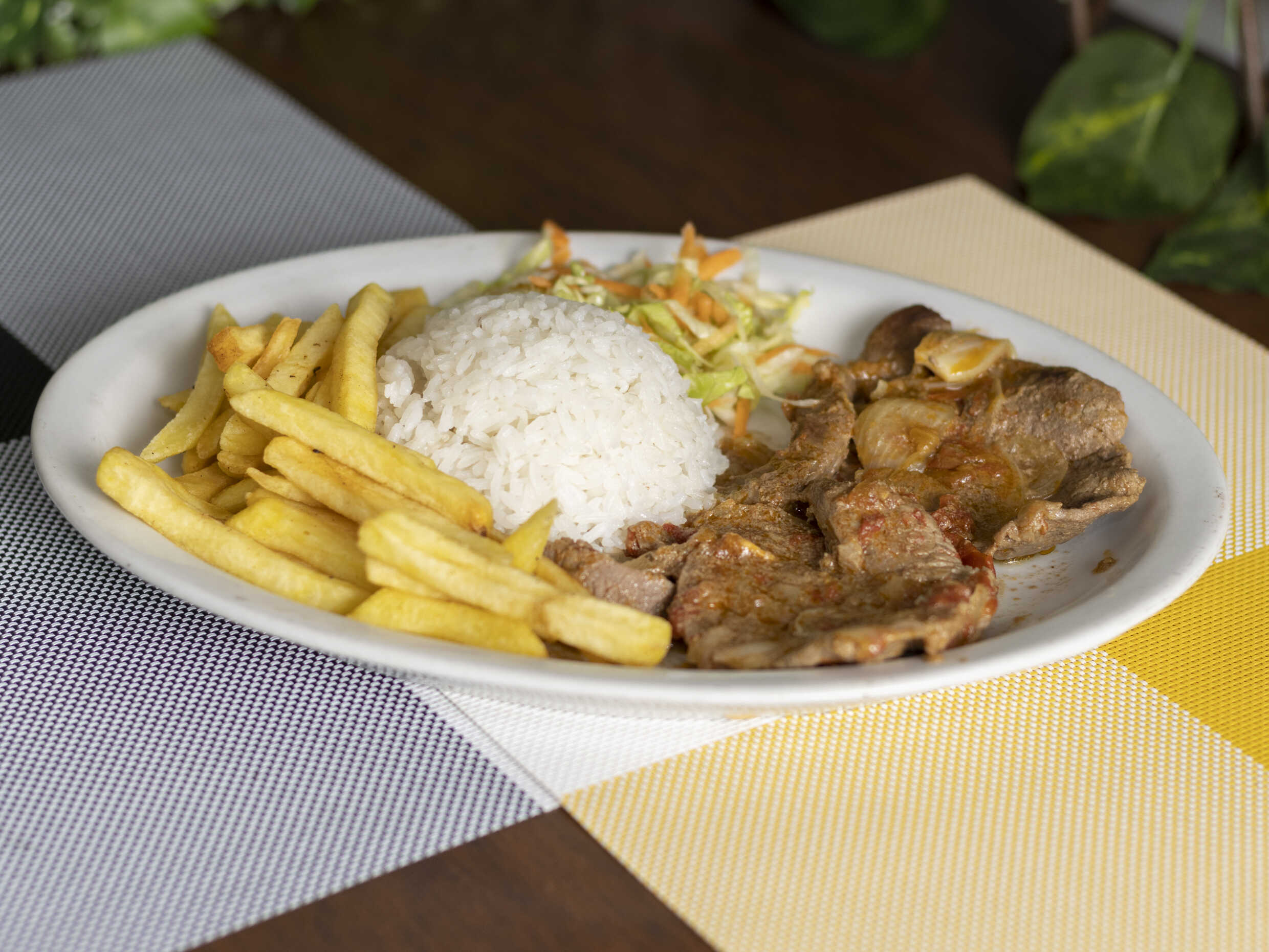 Bistec de res de 200 gramos acompañado de arroz, papas a la francesa, ensalada.