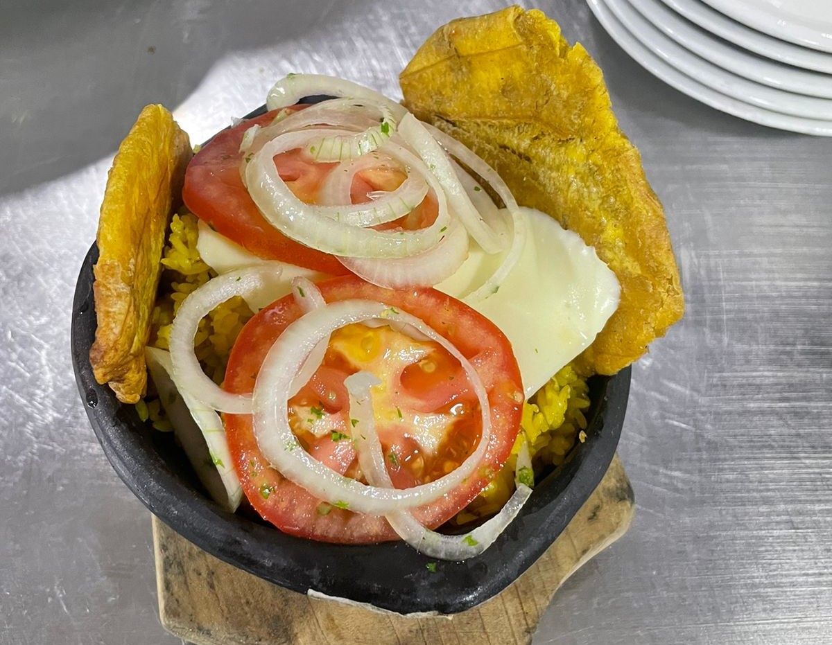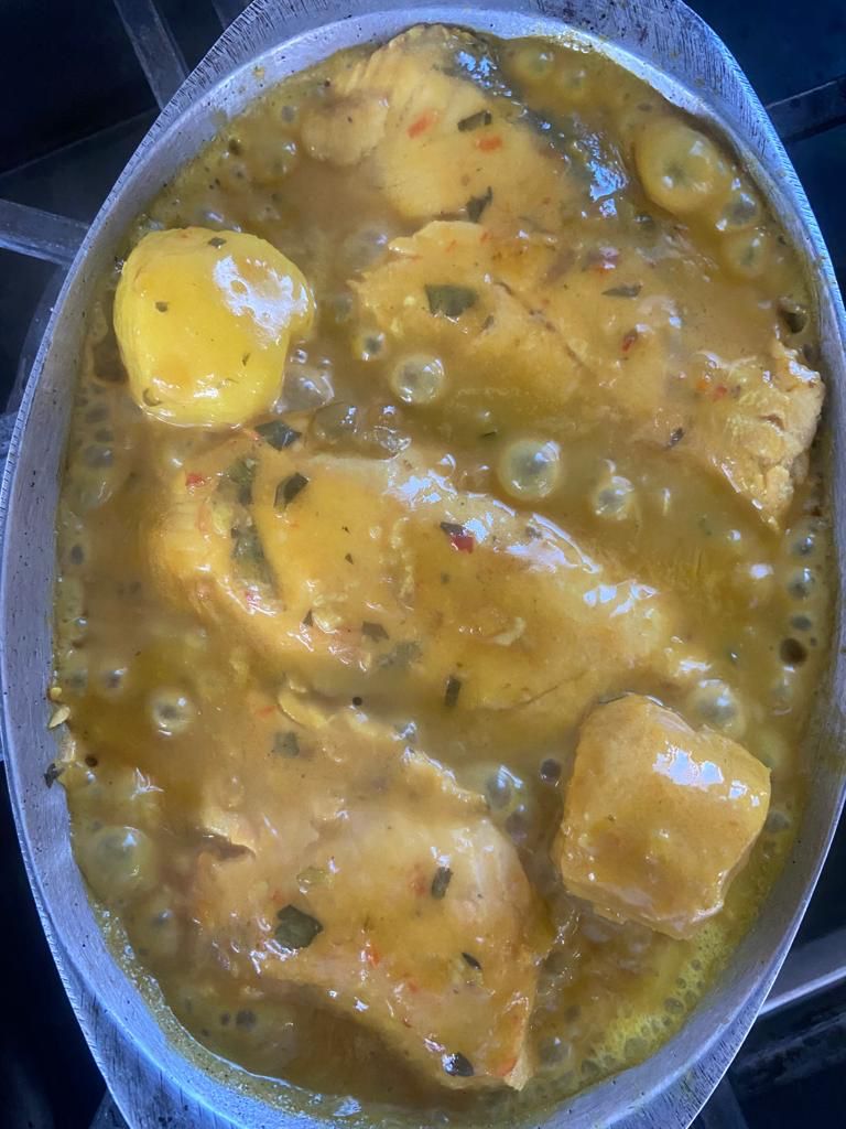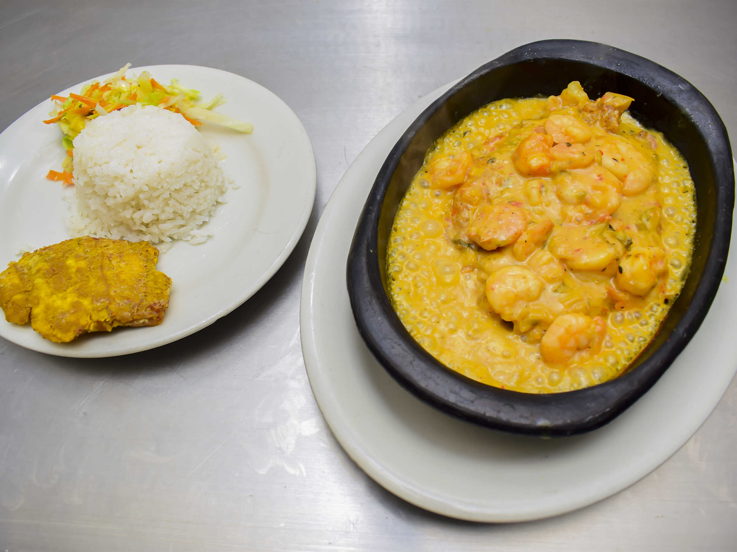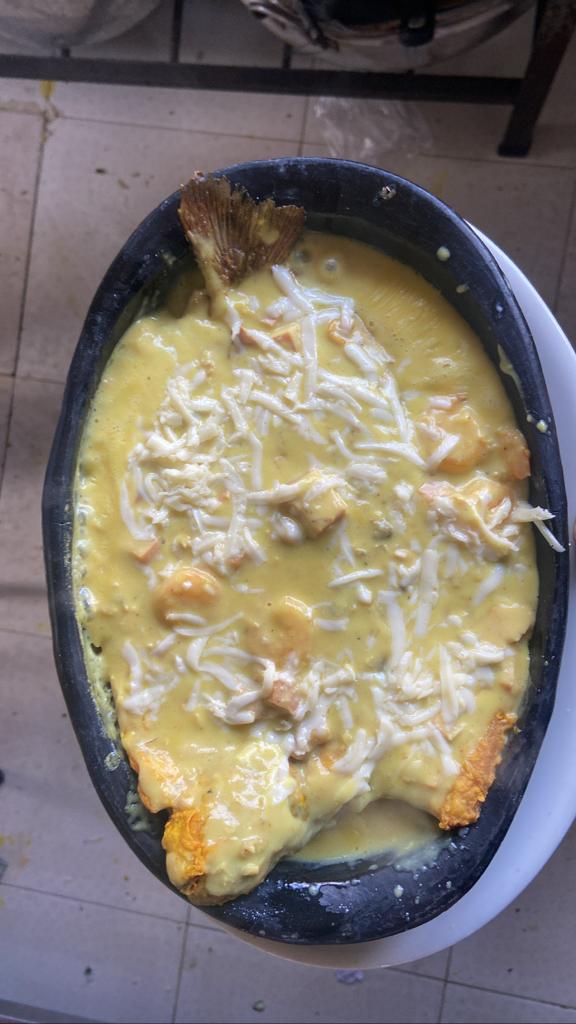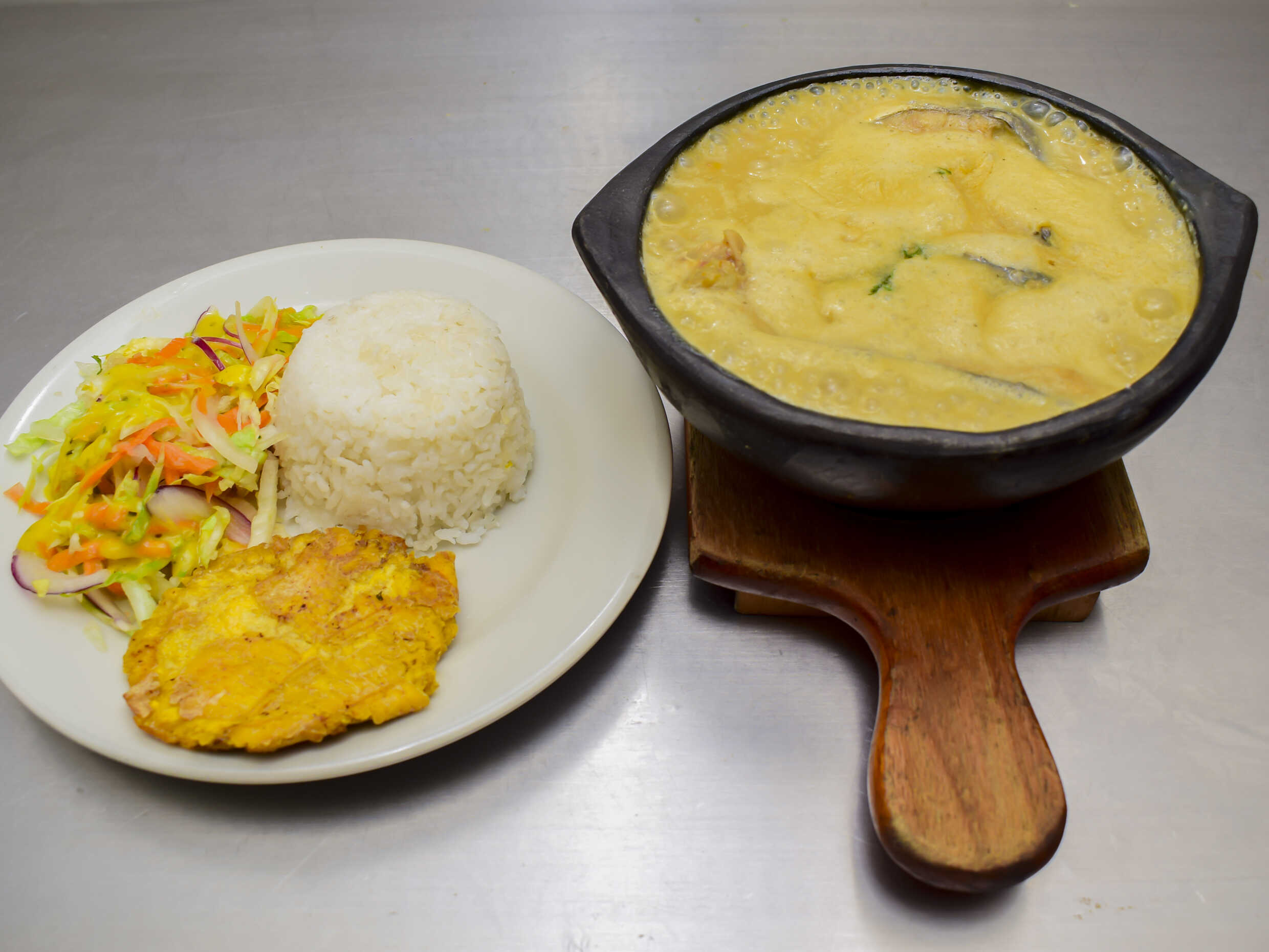 teucha al ajillo acompañado de patacones y sancocho de pescado