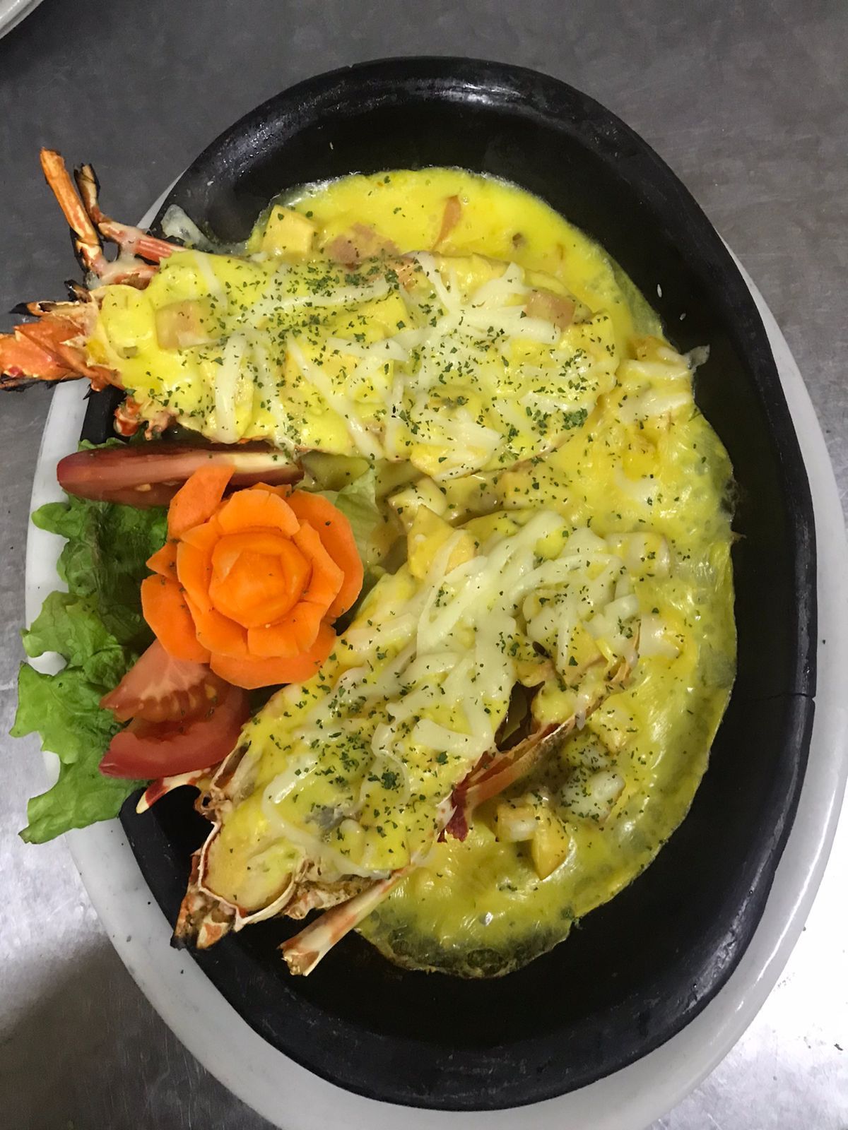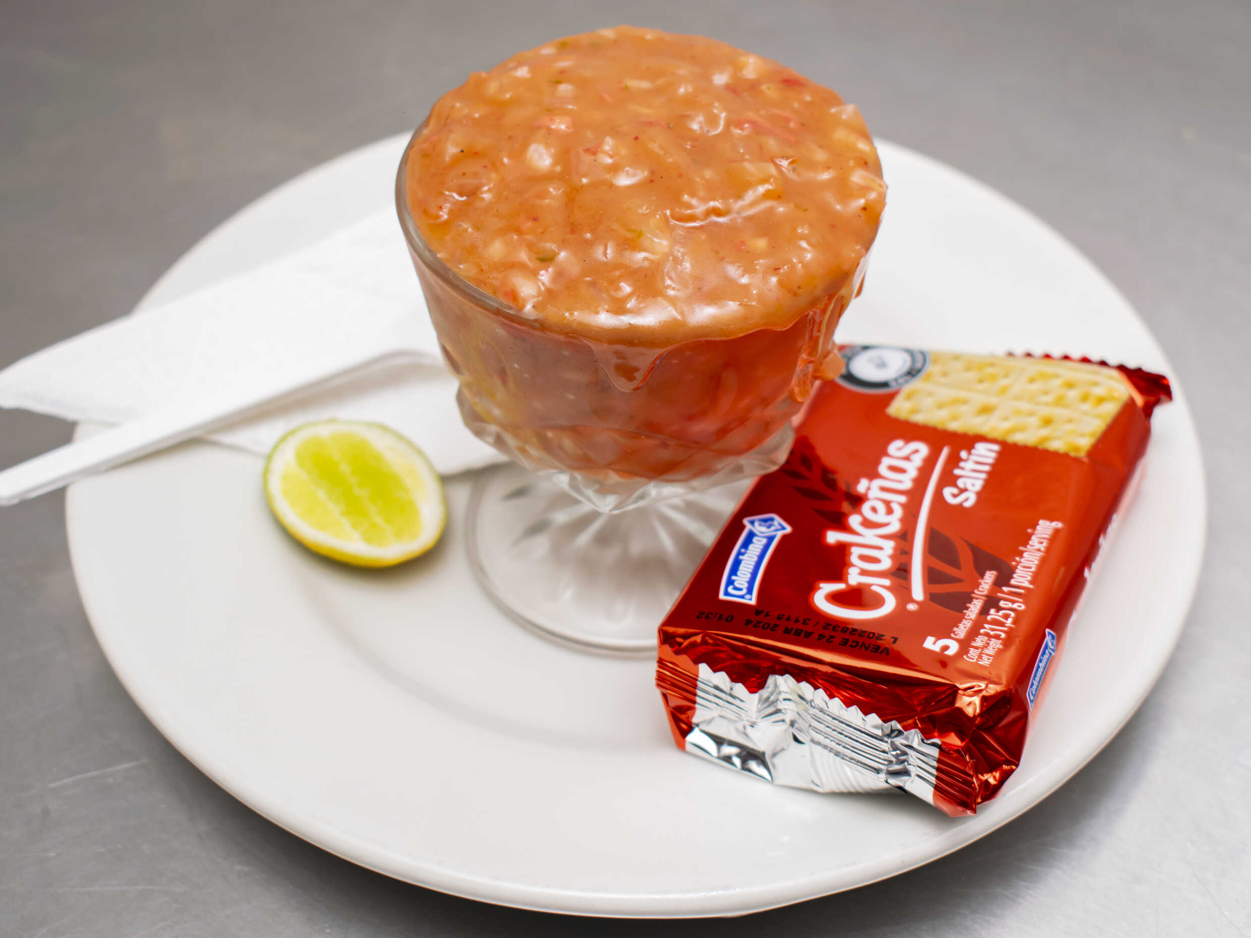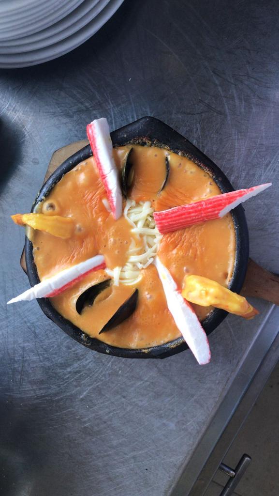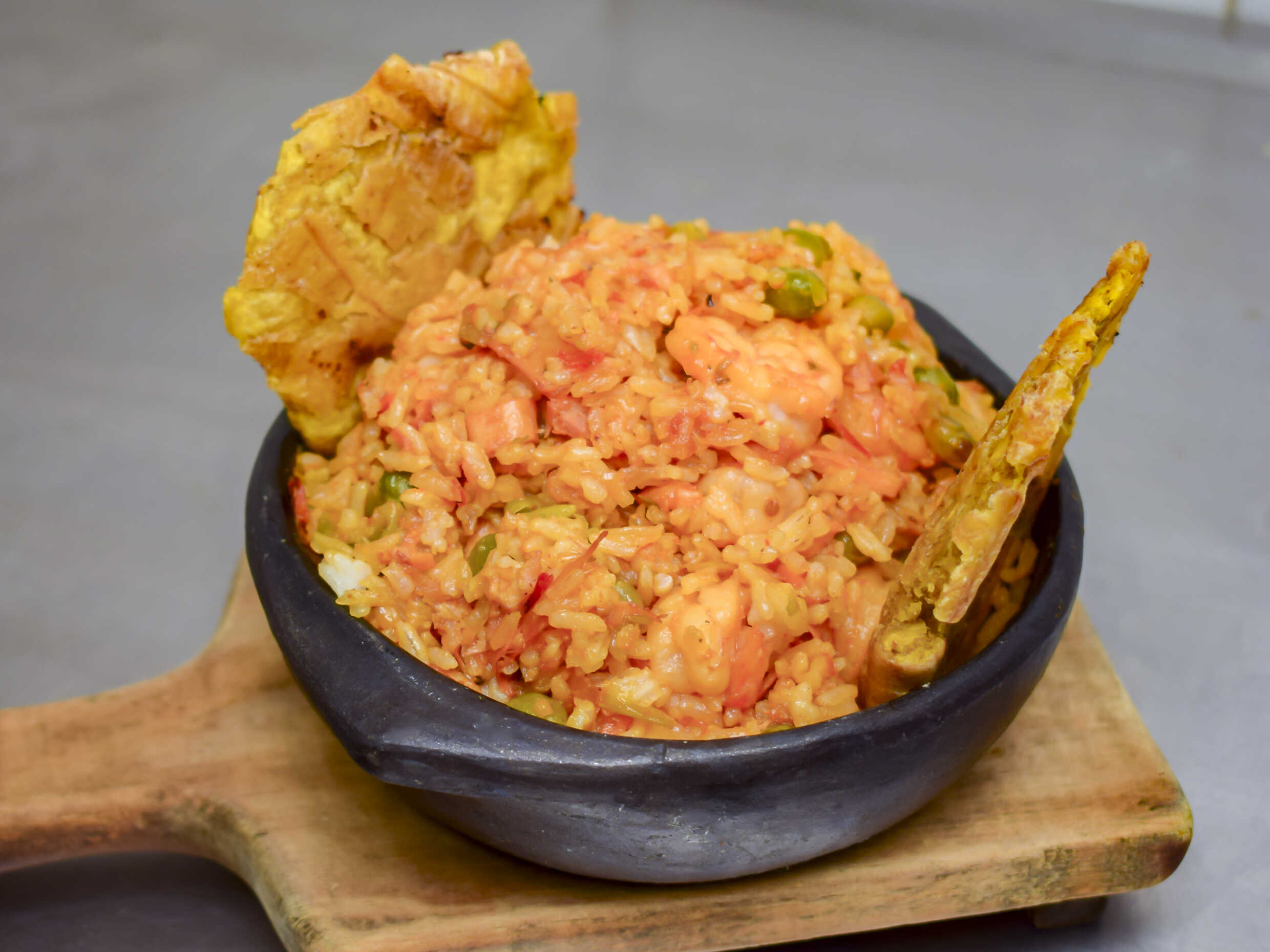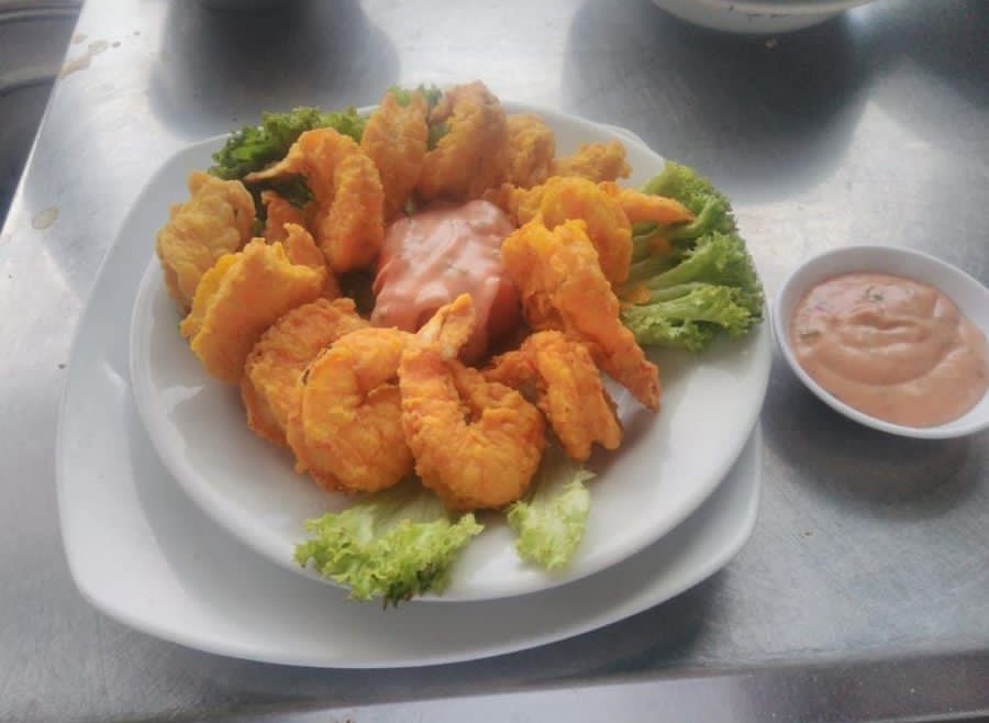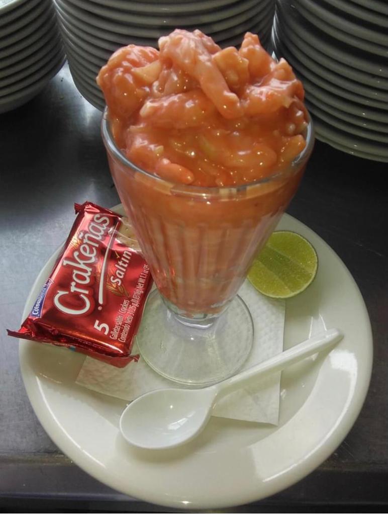 teucha al ajillo acompañado de patacones y sancocho de pescado
