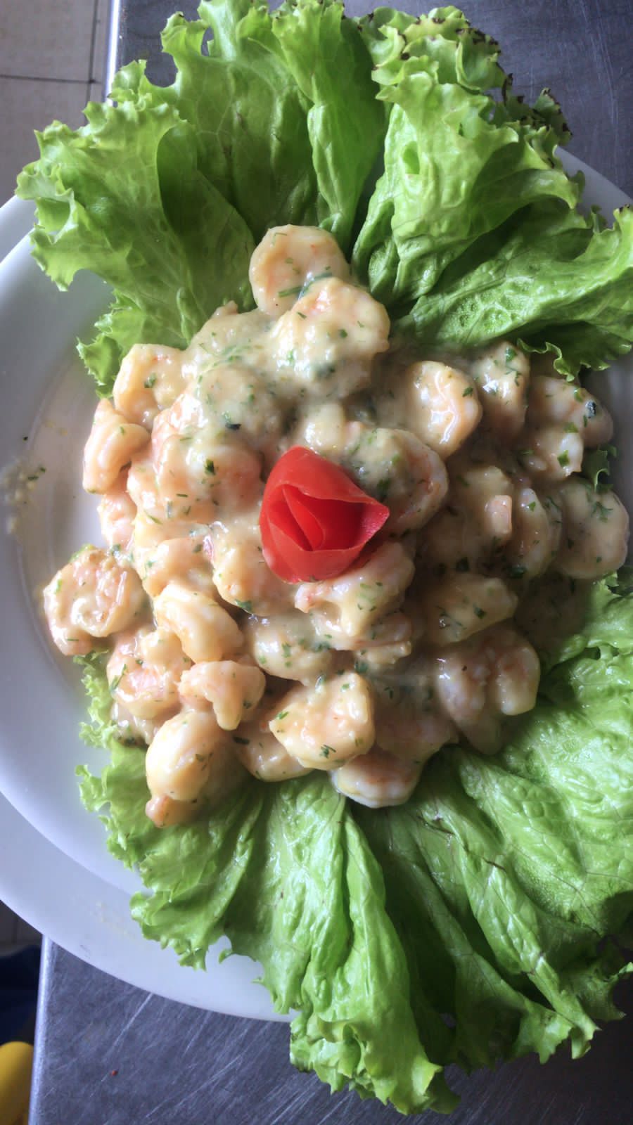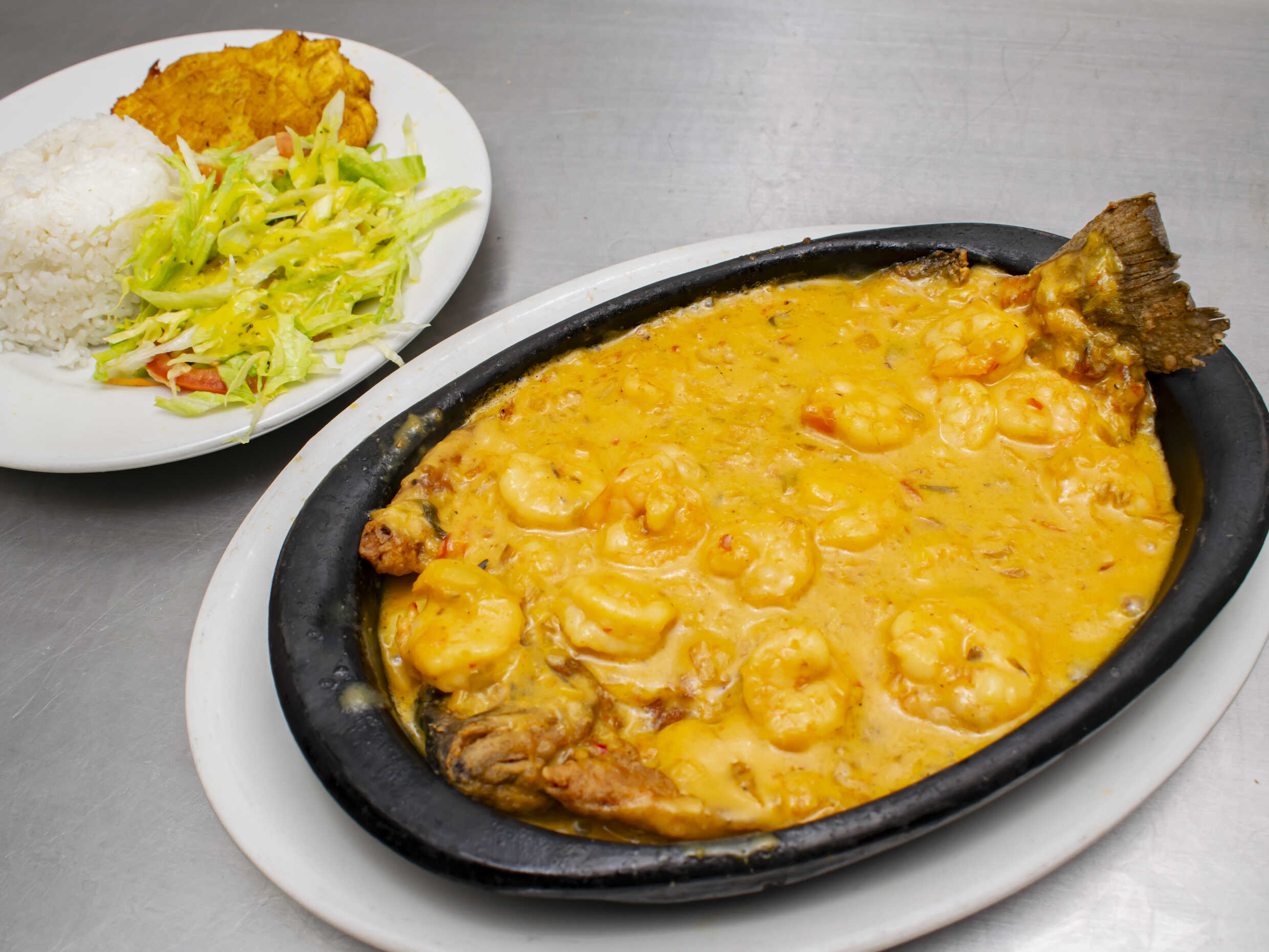 trucha en salsa de camaron, acompañada de patacon, arroz y ensalada verde