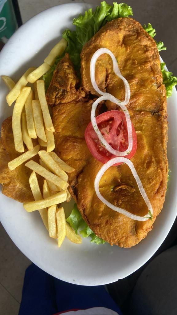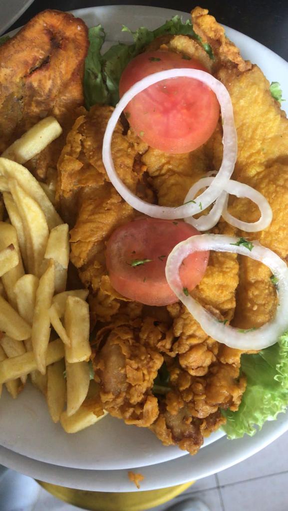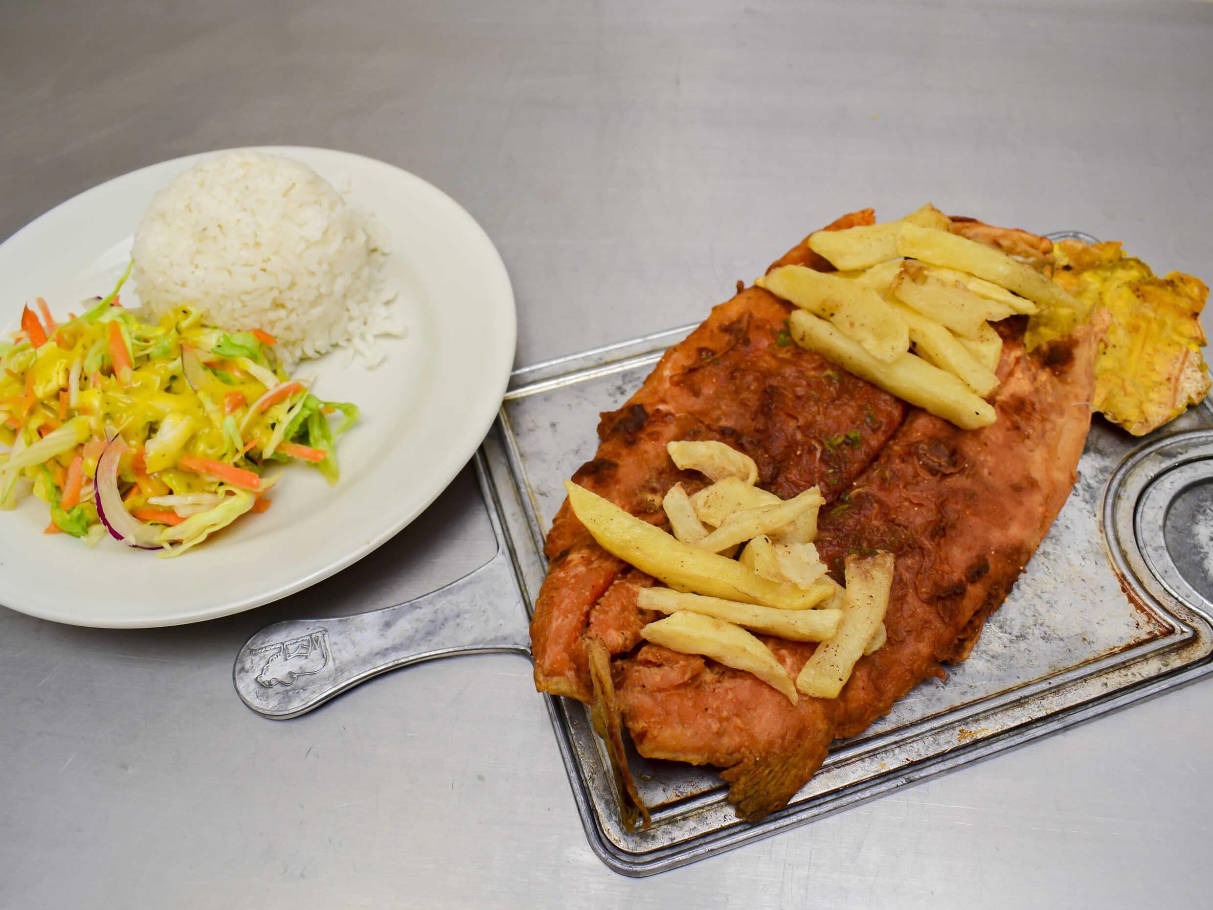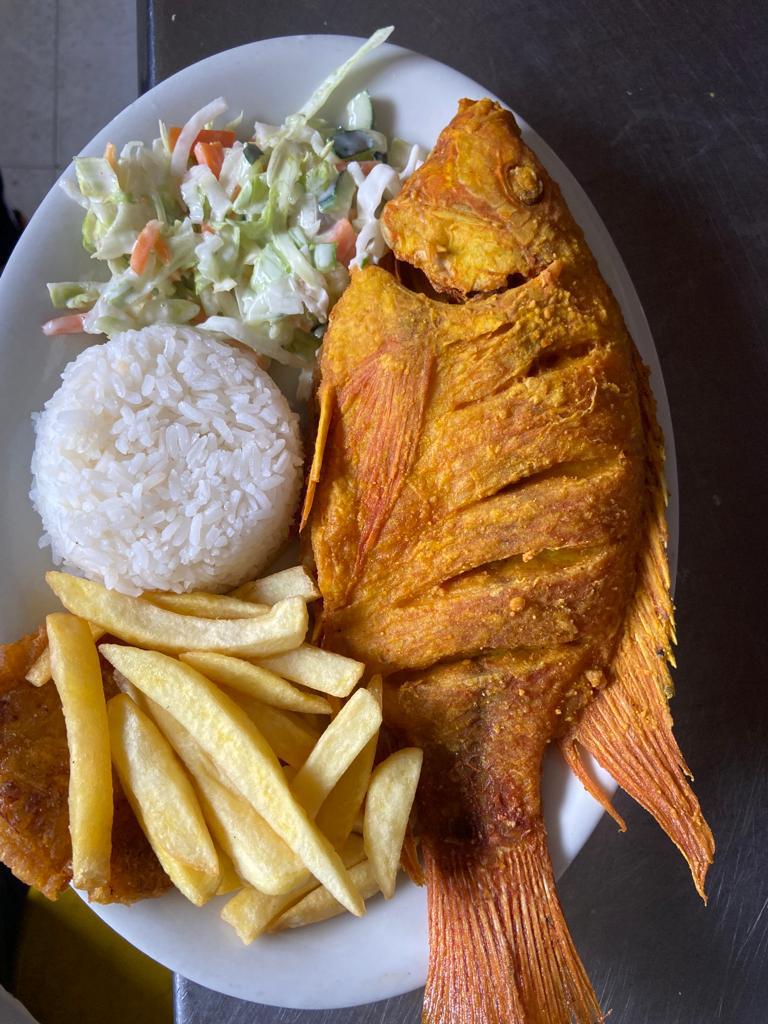 Una Tilapia frita acompañada de Arroz, papas a la francesa y ensalada.