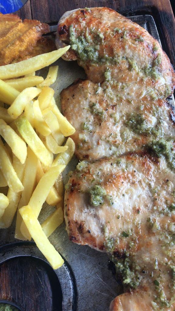 chuleta de pollo , acompañada de arroz y papas a la francesa con ensalada verde