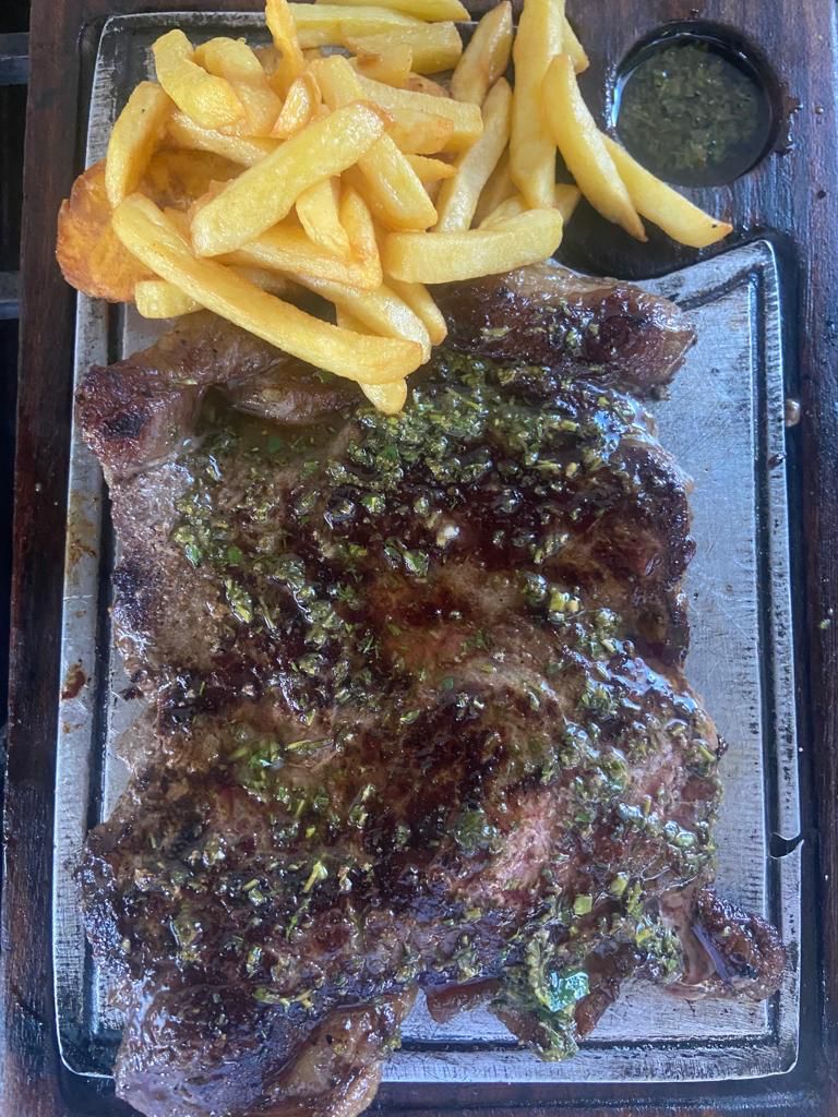 costillas cubiertas en salsa bbq, acompañada de papas a la francesa