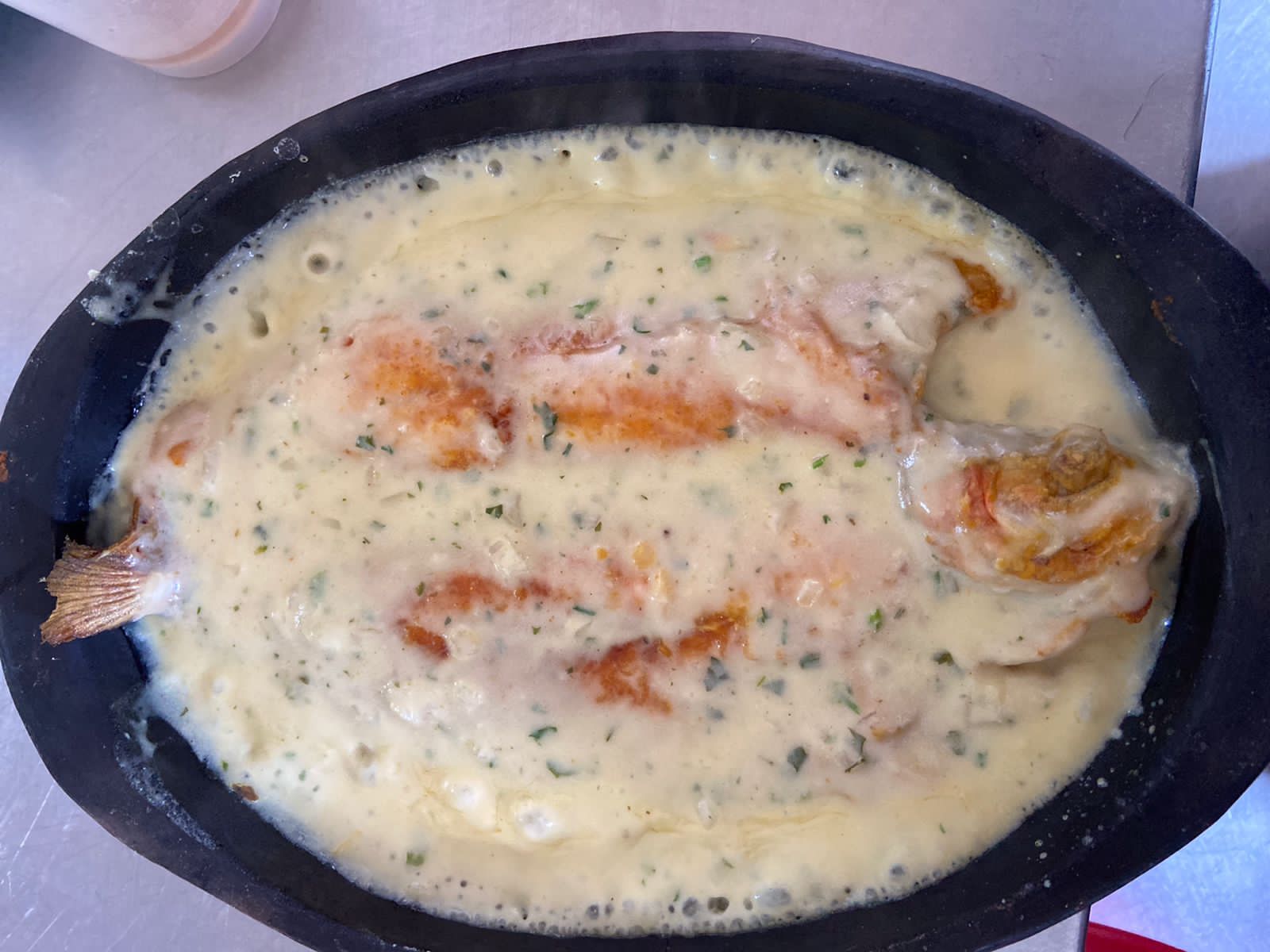 trucha salsa de la casa, acompañada de arroz ensalada verde y sancocho de pescado