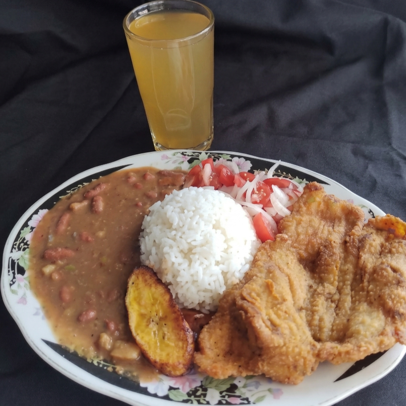 Principio, y proteína a elección, acompañado de arroz y ensalada de lechuga, tomate y cebolla.