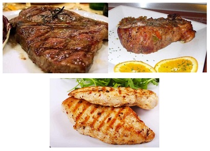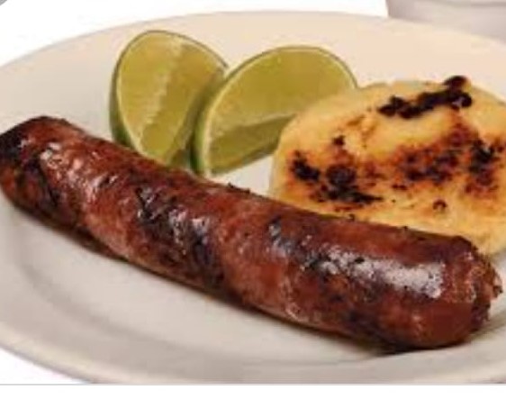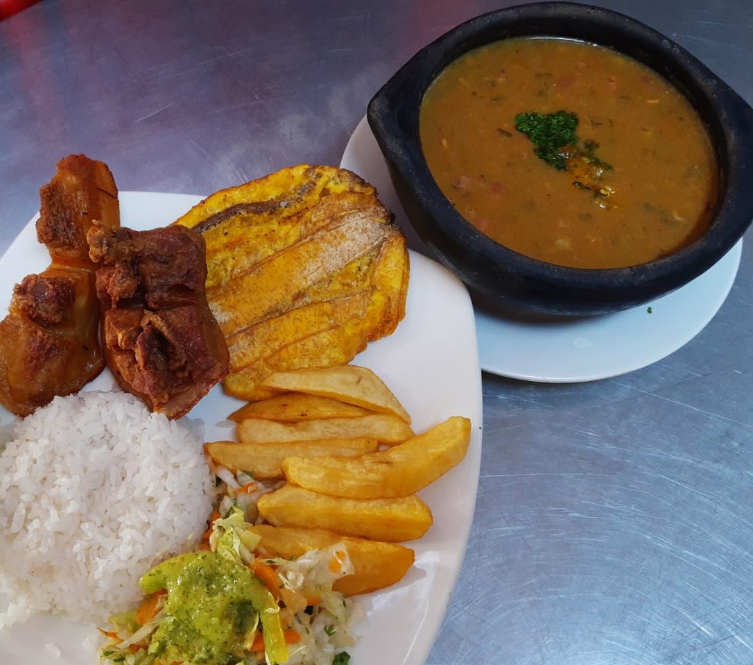 Carne , costilla ahumada, filete de pollo, chorizo, papas fritas y monedas de platano.
