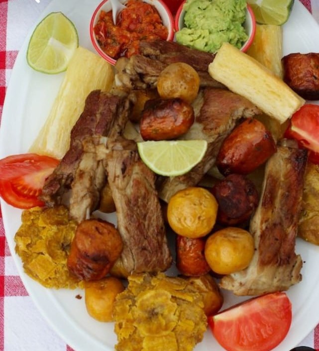 Carne asada, costilla ahumada, filete de pollo, chorizo, chicharrón, papas fritas y monedas de platano.