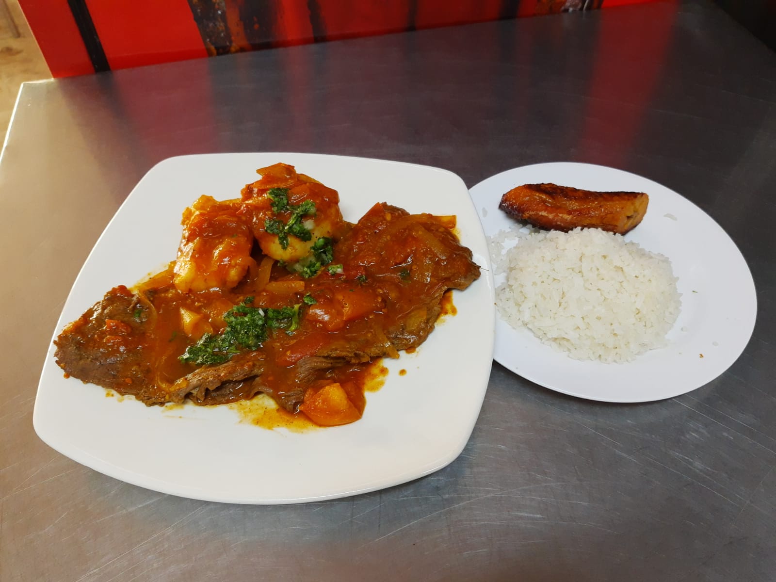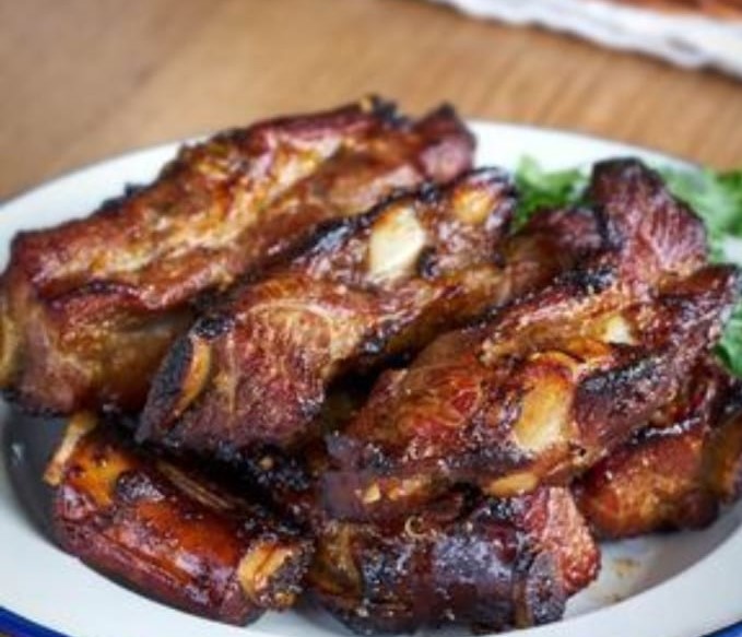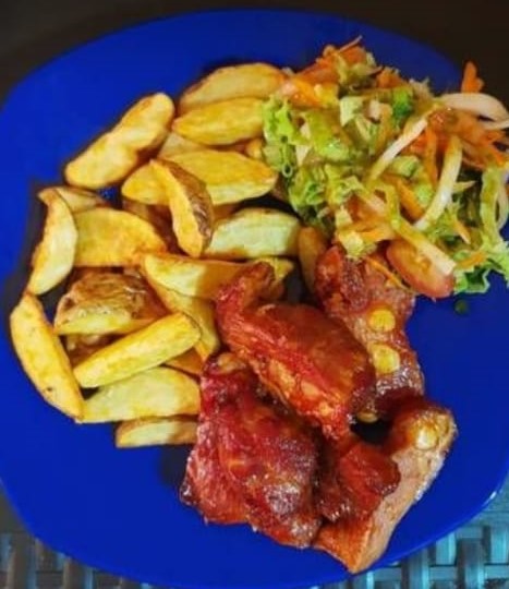 Costilla ahumada (280 gr) acompañada de papas a la francesa( 80 grms), porcion de maduro, porción de arroz pequeña y ensalada del dia