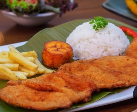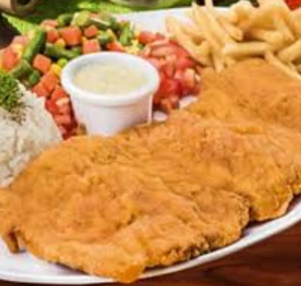 Chuleta de pollo de 150 gramos personal acompañada de papas a la francesa, maduro, porción de arroz, ensalada