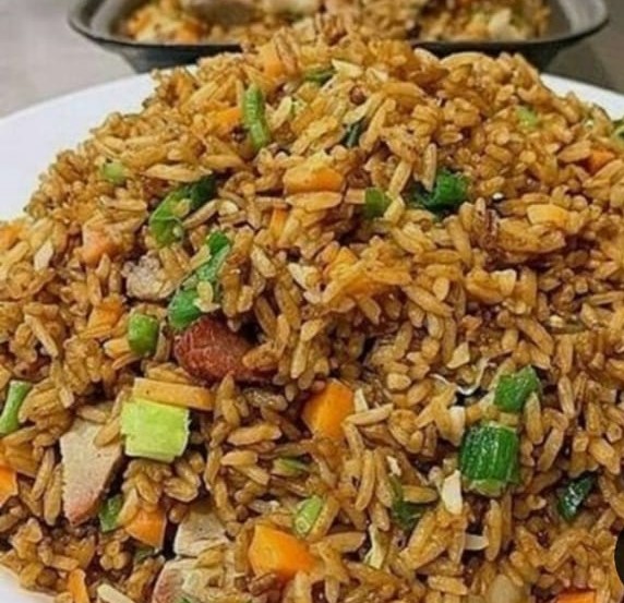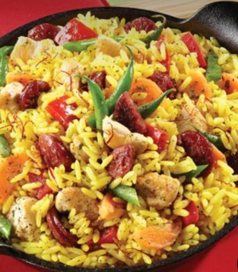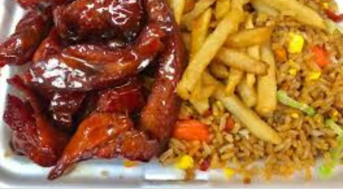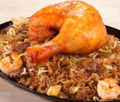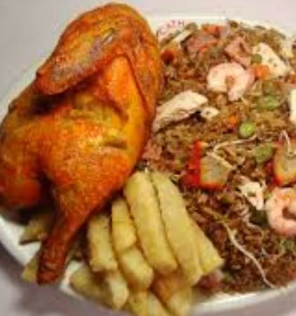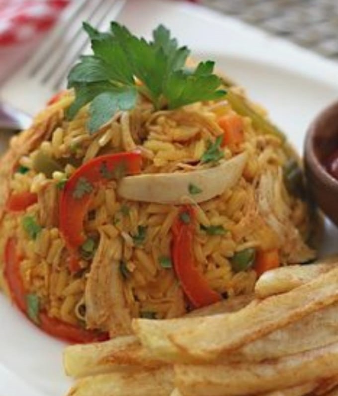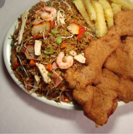 350 gramos de arroz con pollo acompañado con papas a la francesa.