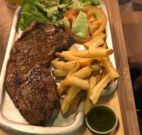 450 gramos de proteína acompañada de arroz, papas a la francesa y ensalada de la casa (lechuga batavia, zanahoria y cebolla).