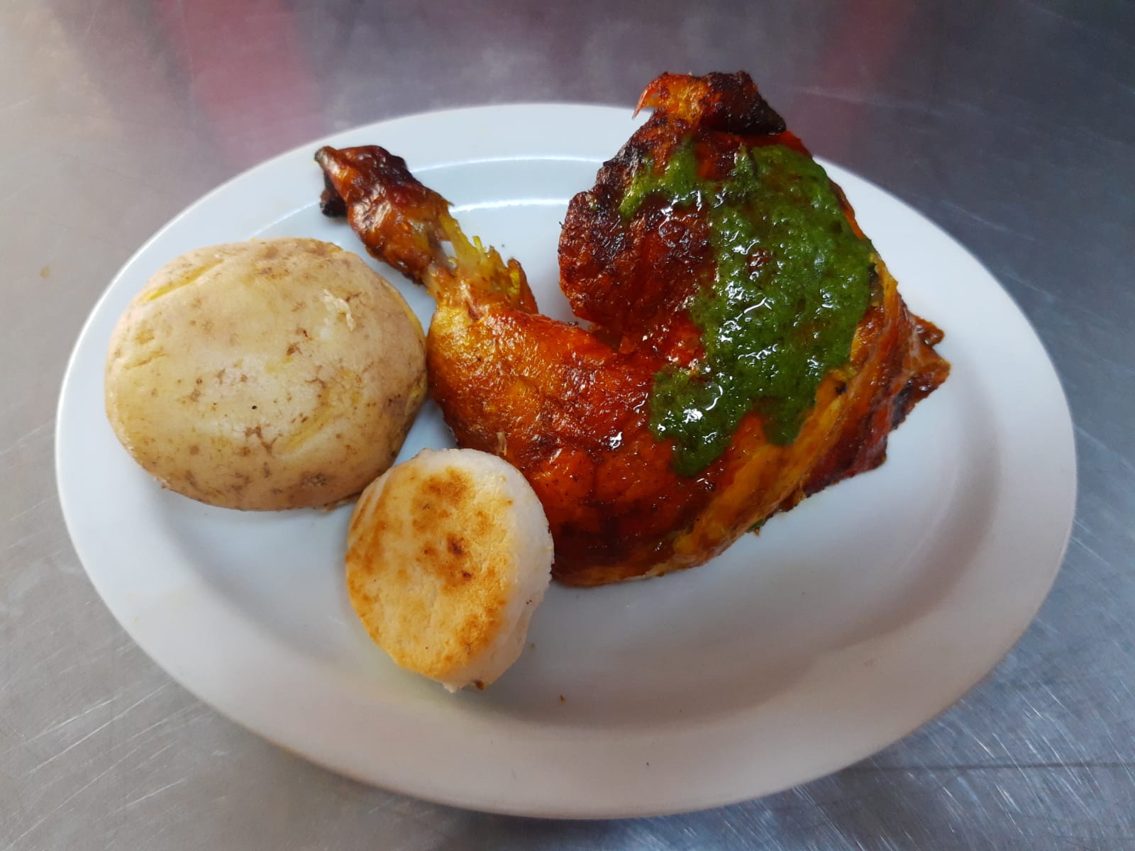 2 presas de pollo + 1 papa cocinada + 1 arepa.