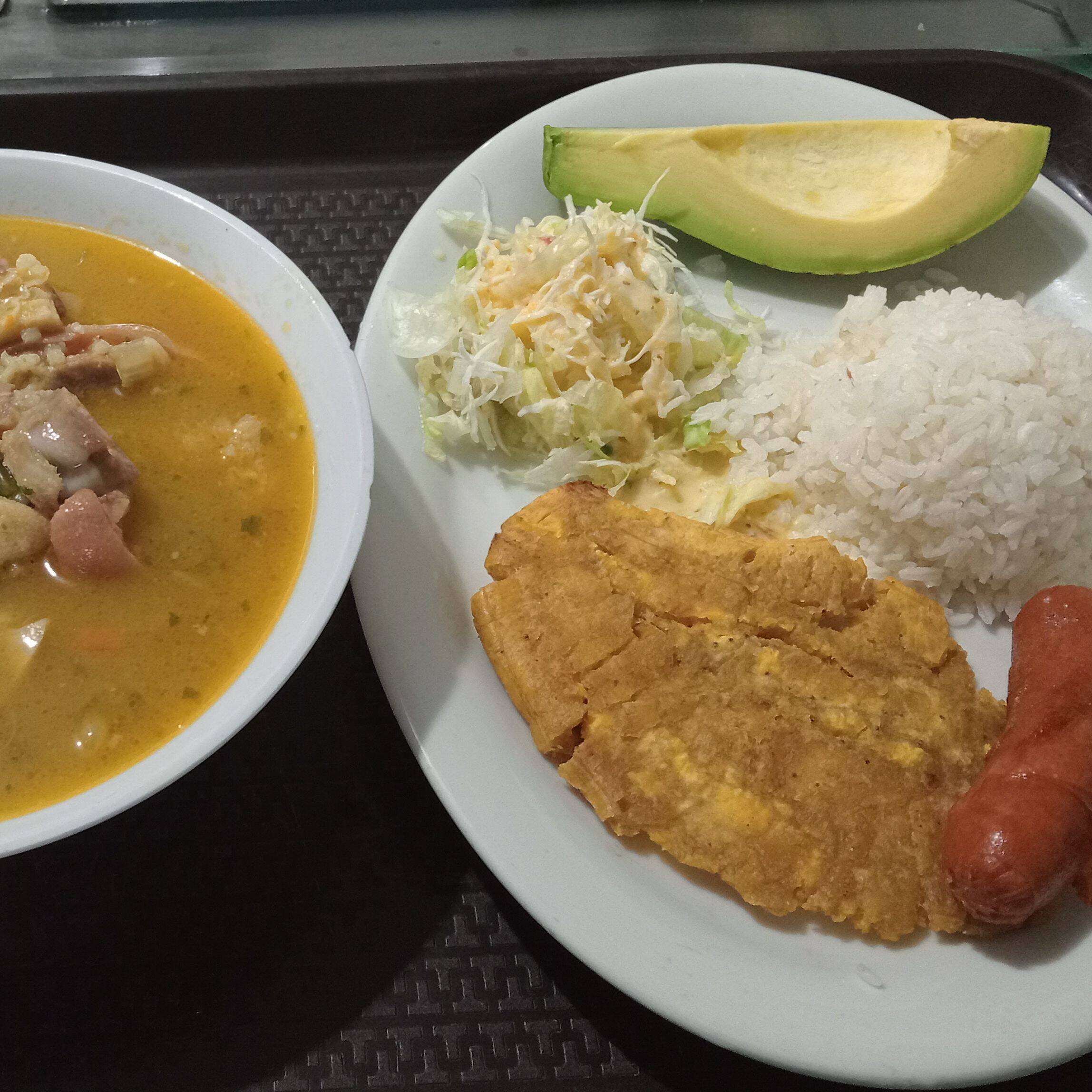 Cazuela de frijoles, arroz ensalada, patacón, aguacate y la costilla ahumada frita.